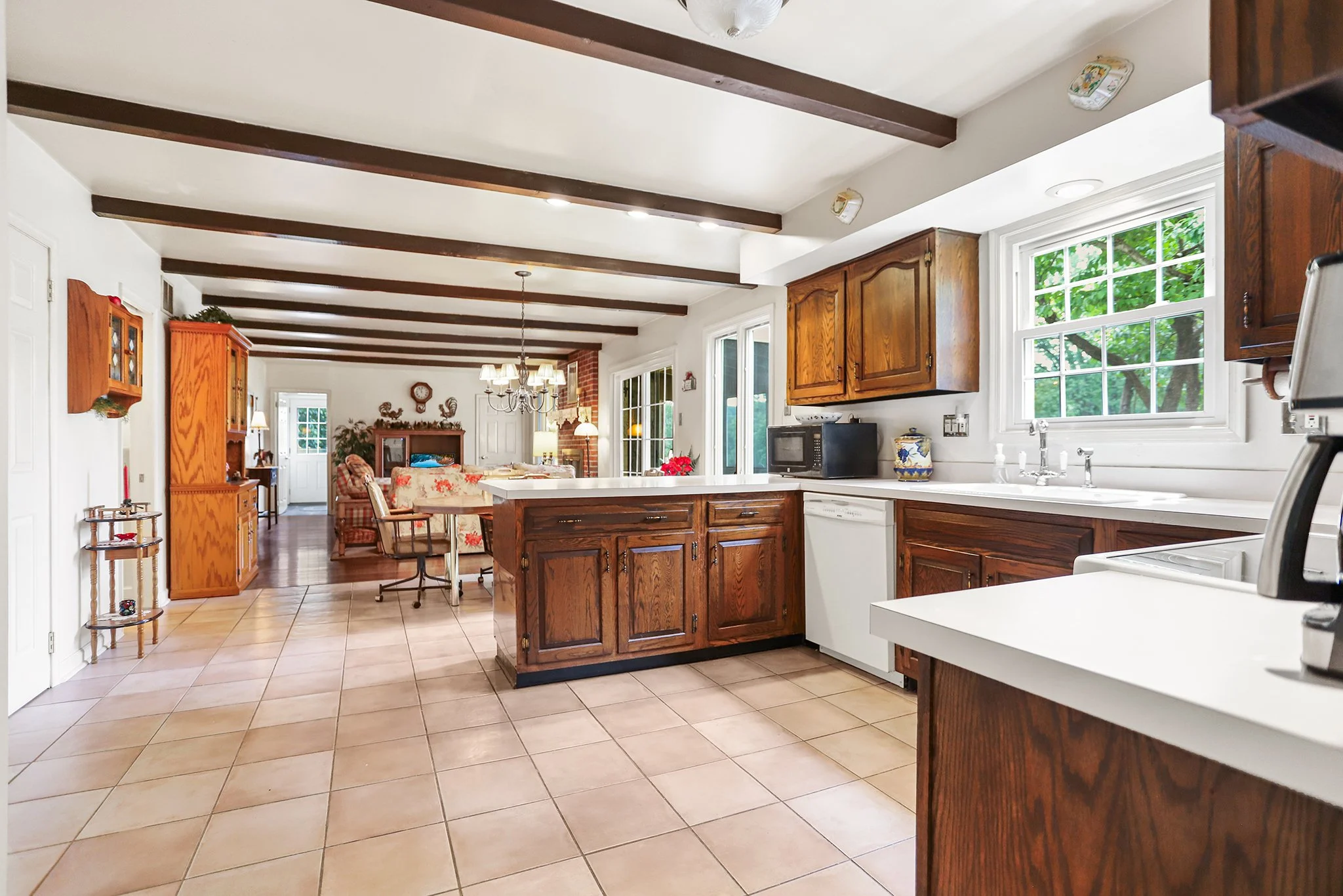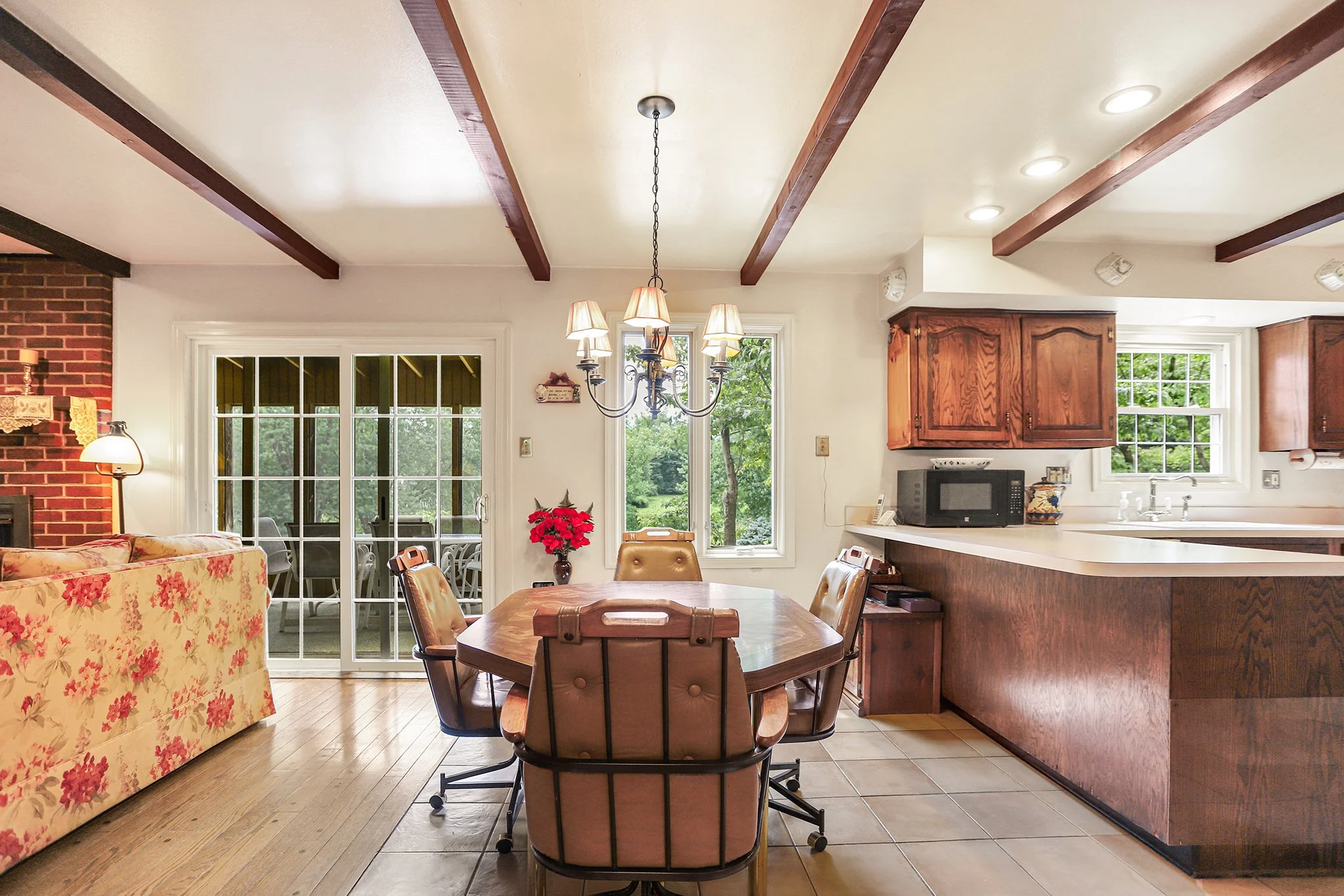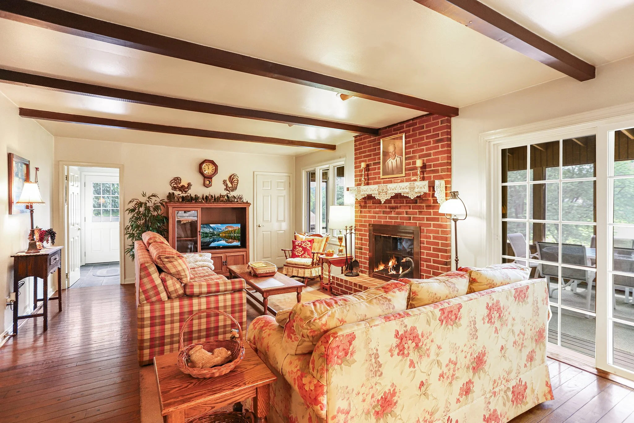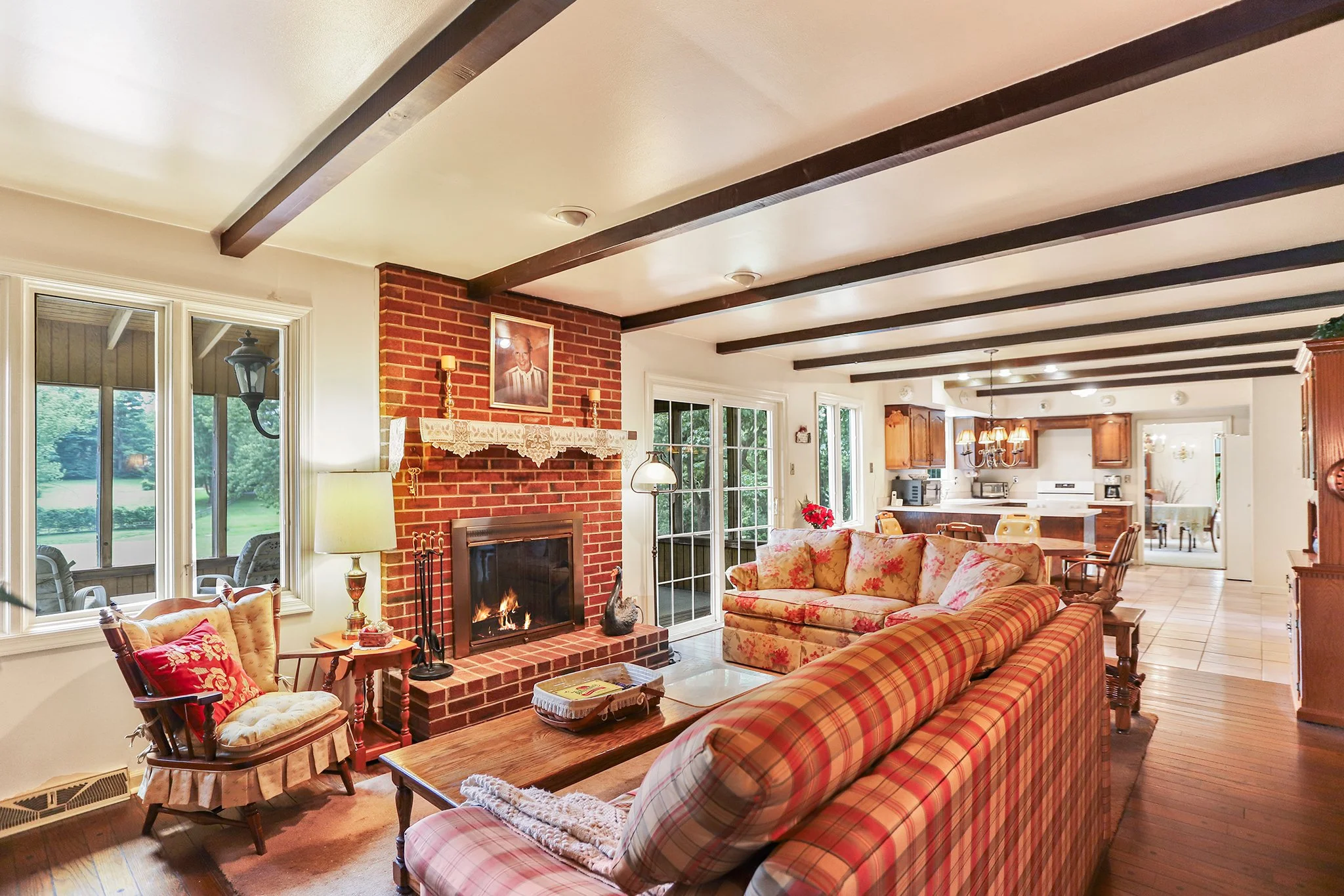 Step inside to discover a warm and welcoming layout featuring a large sunny living room, a spacious great room with a cozy fireplace, wood beamed ceiling and direct access to a screened-in porch, perfect for relaxing or entertaining year-round. The sun-drenched solarium brings the outdoors in, offering a peaceful space to unwind with your morning coffee or evening book.