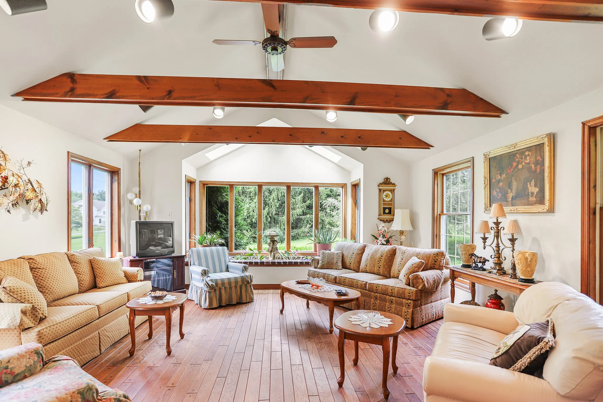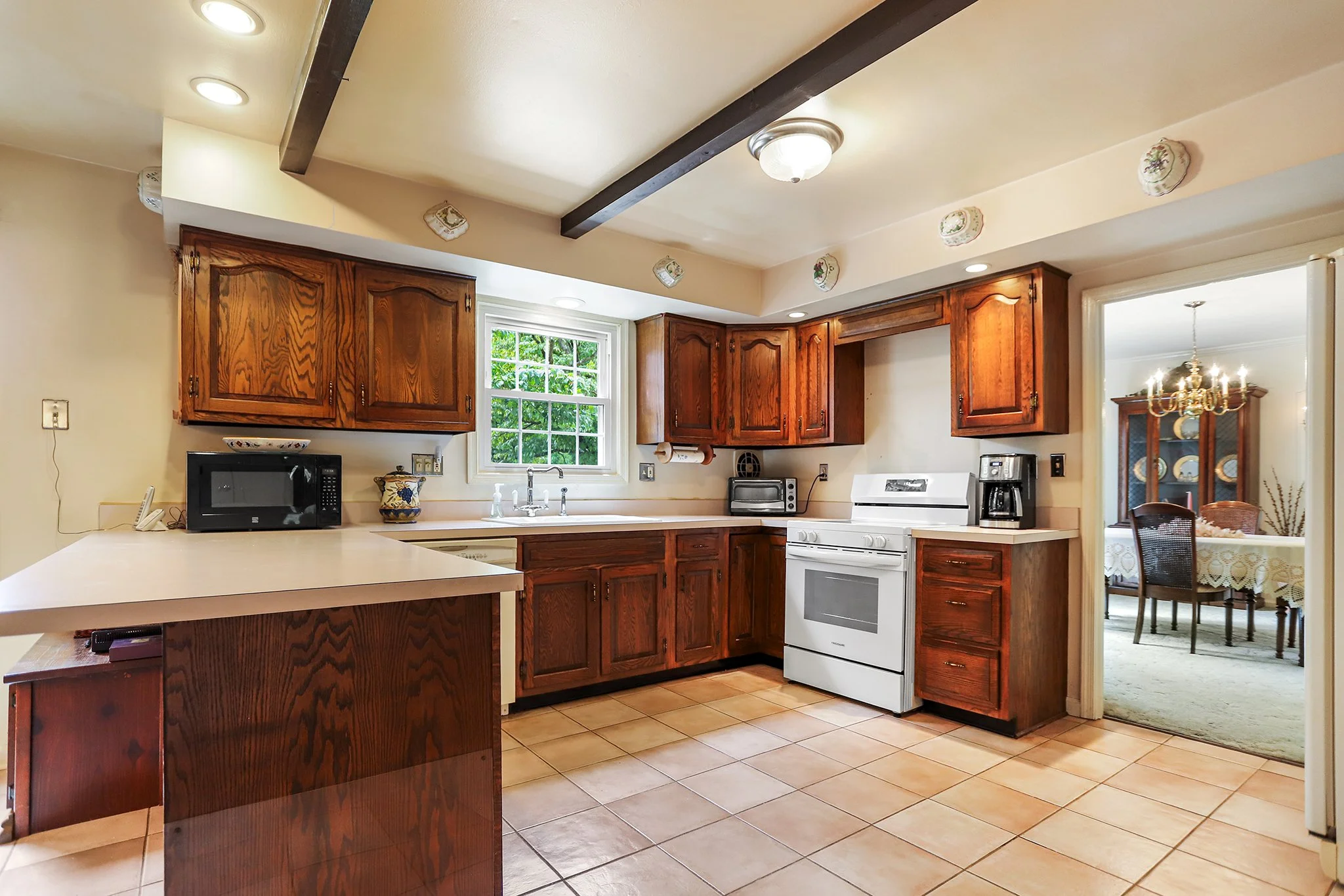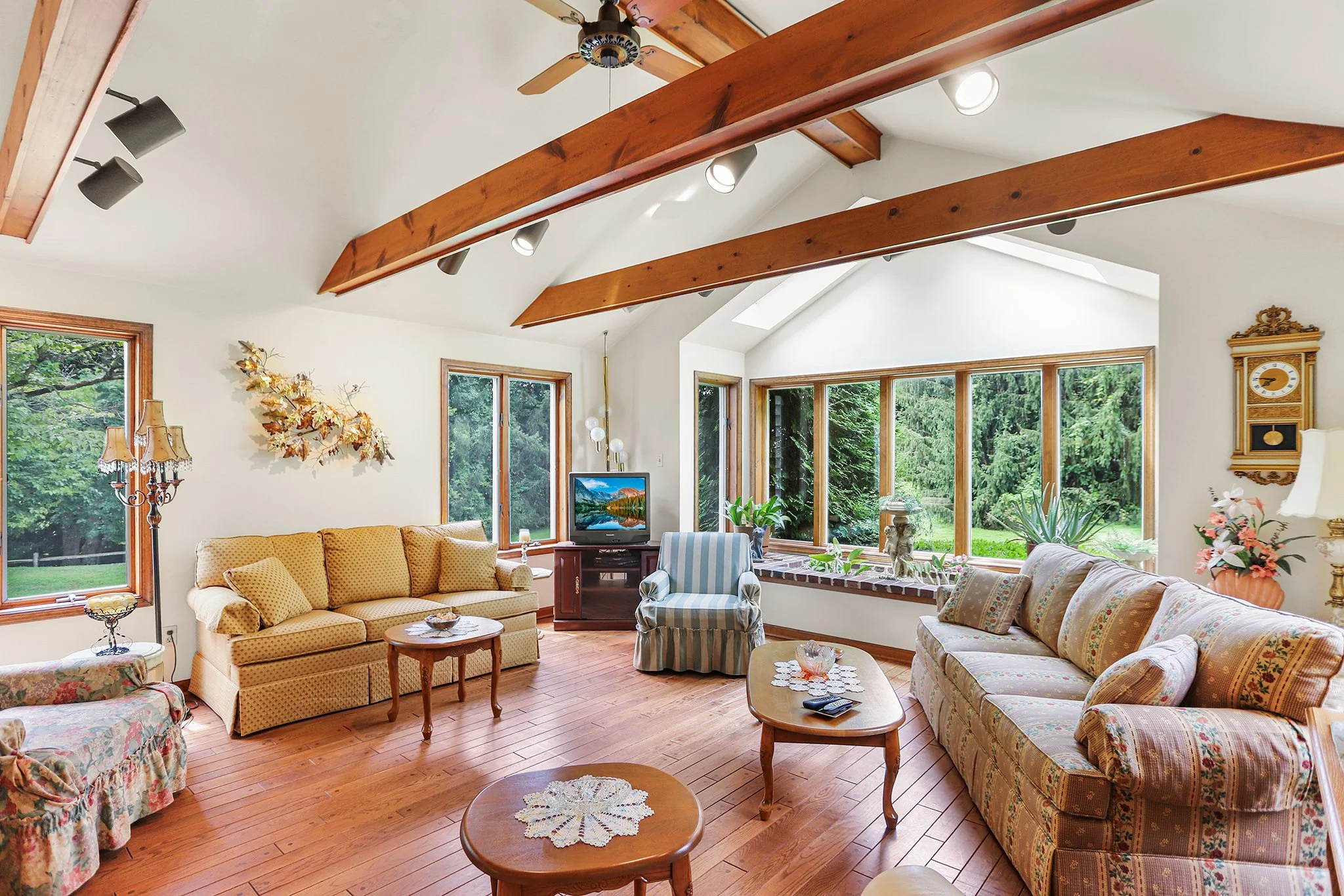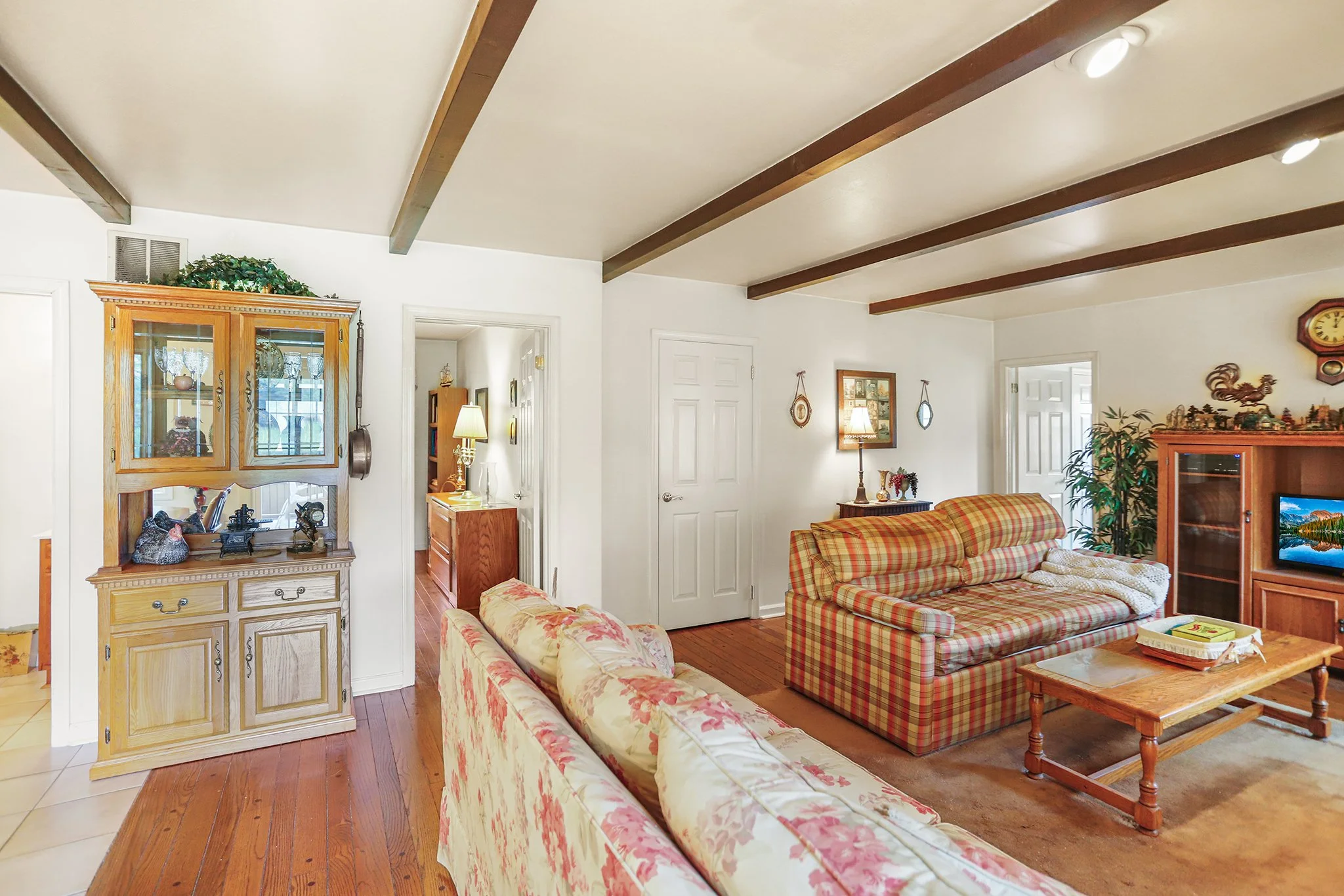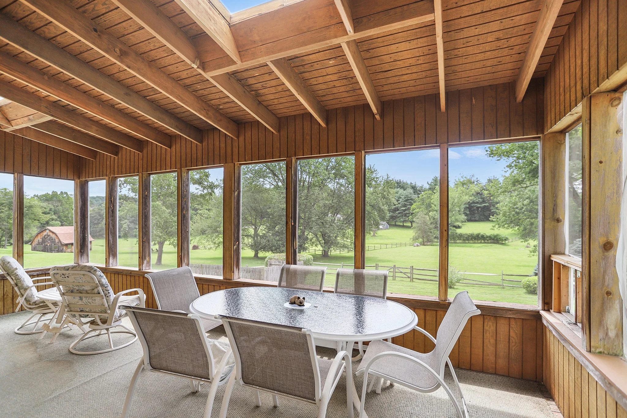 Step inside to discover a warm and welcoming layout featuring a large sunny living room, a spacious great room with a cozy fireplace, wood beamed ceiling and direct access to a screened-in porch, perfect for relaxing or entertaining year-round. The sun-drenched solarium brings the outdoors in, offering a peaceful space to unwind with your morning coffee or evening book.