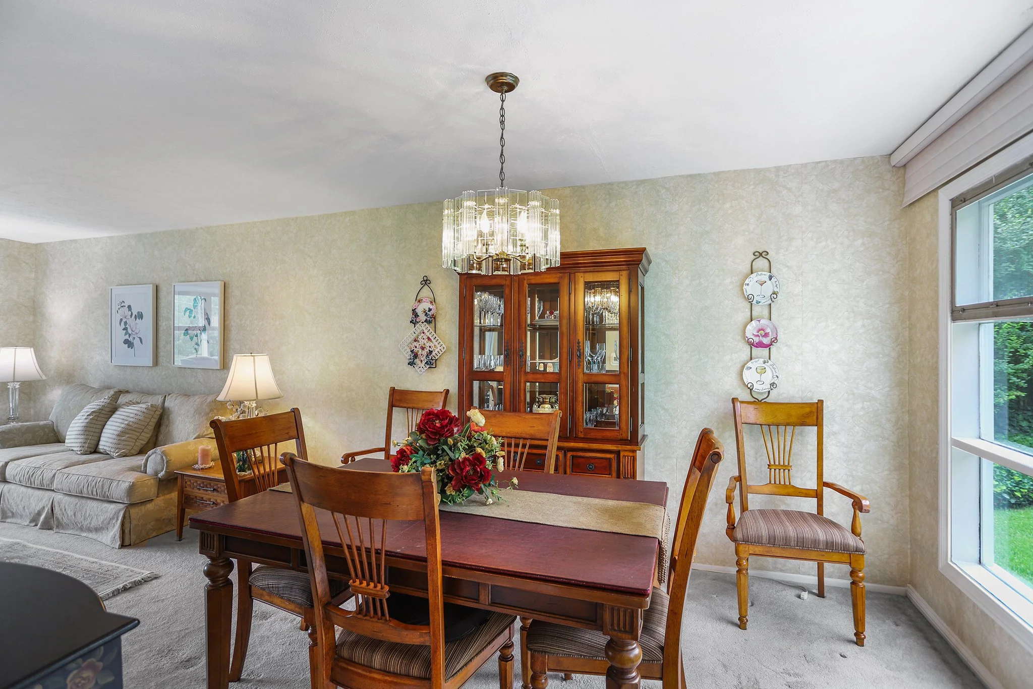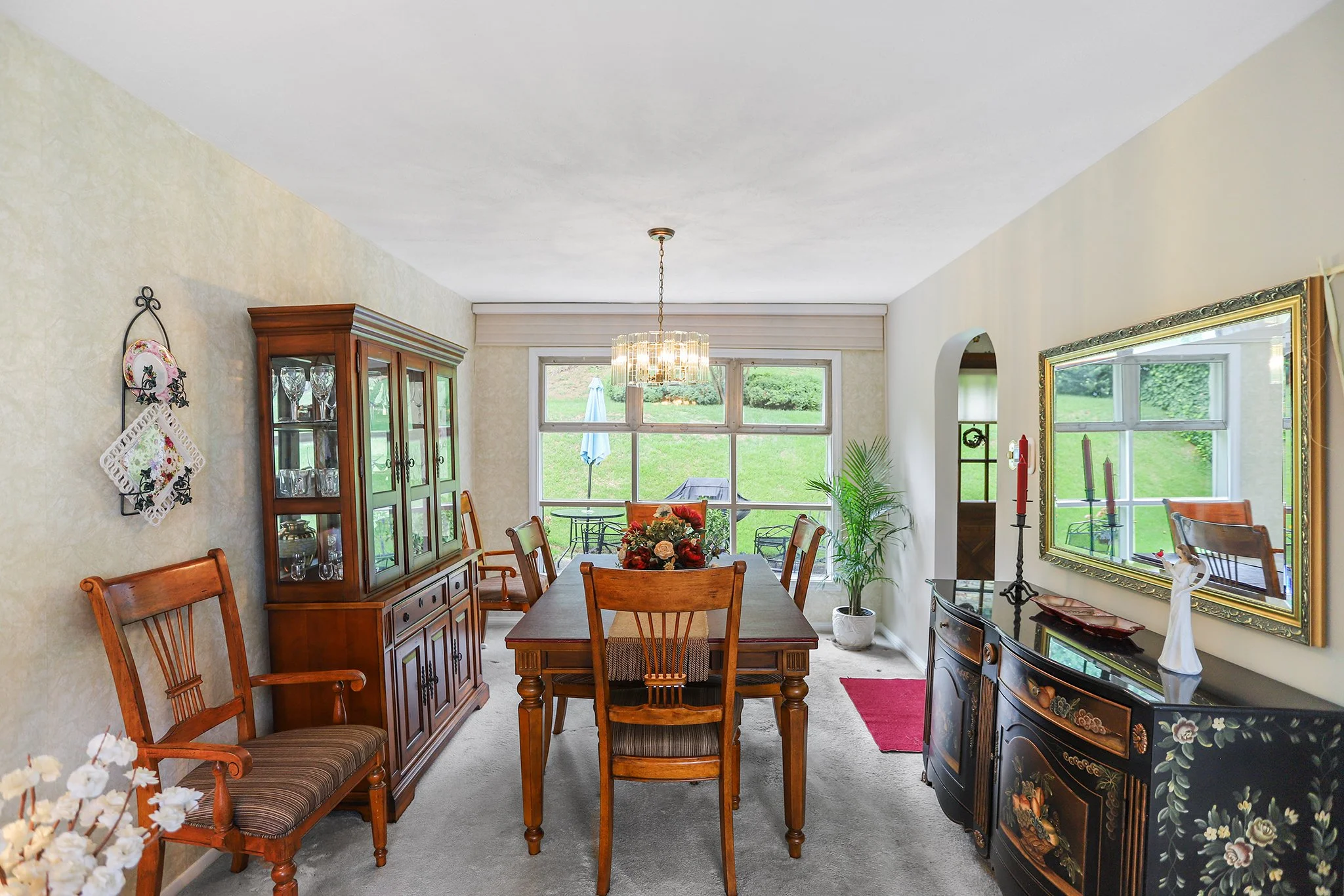 The eat-in kitchen offers a functional layout with a cozy breakfast bar—perfect for casual meals or morning coffee, especially looking over the serene backyard, and tons of storage. A semi-open floor plan allows for the ease of entertaining, including indoor/outdoor living with access to the backyard through the kitchen.