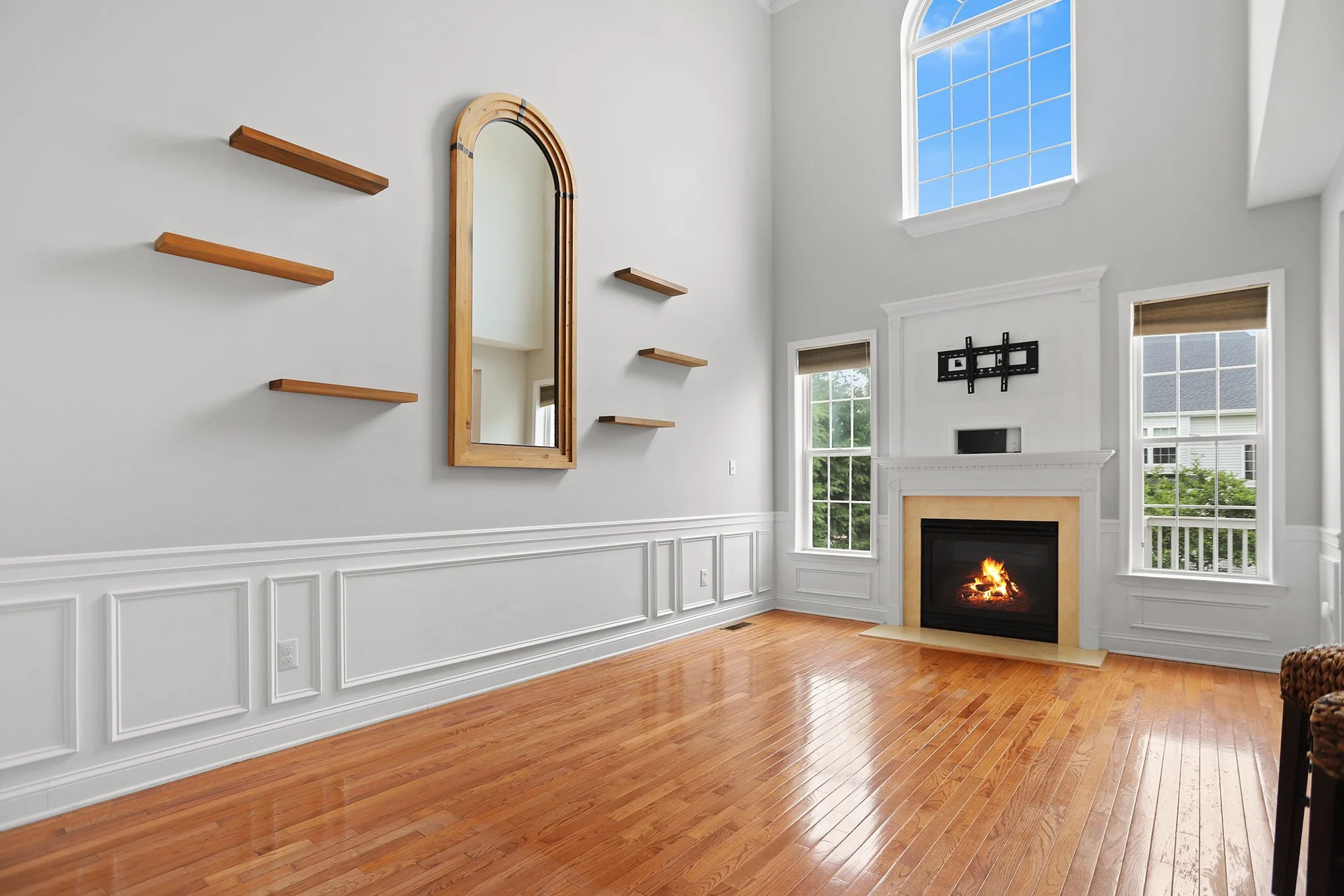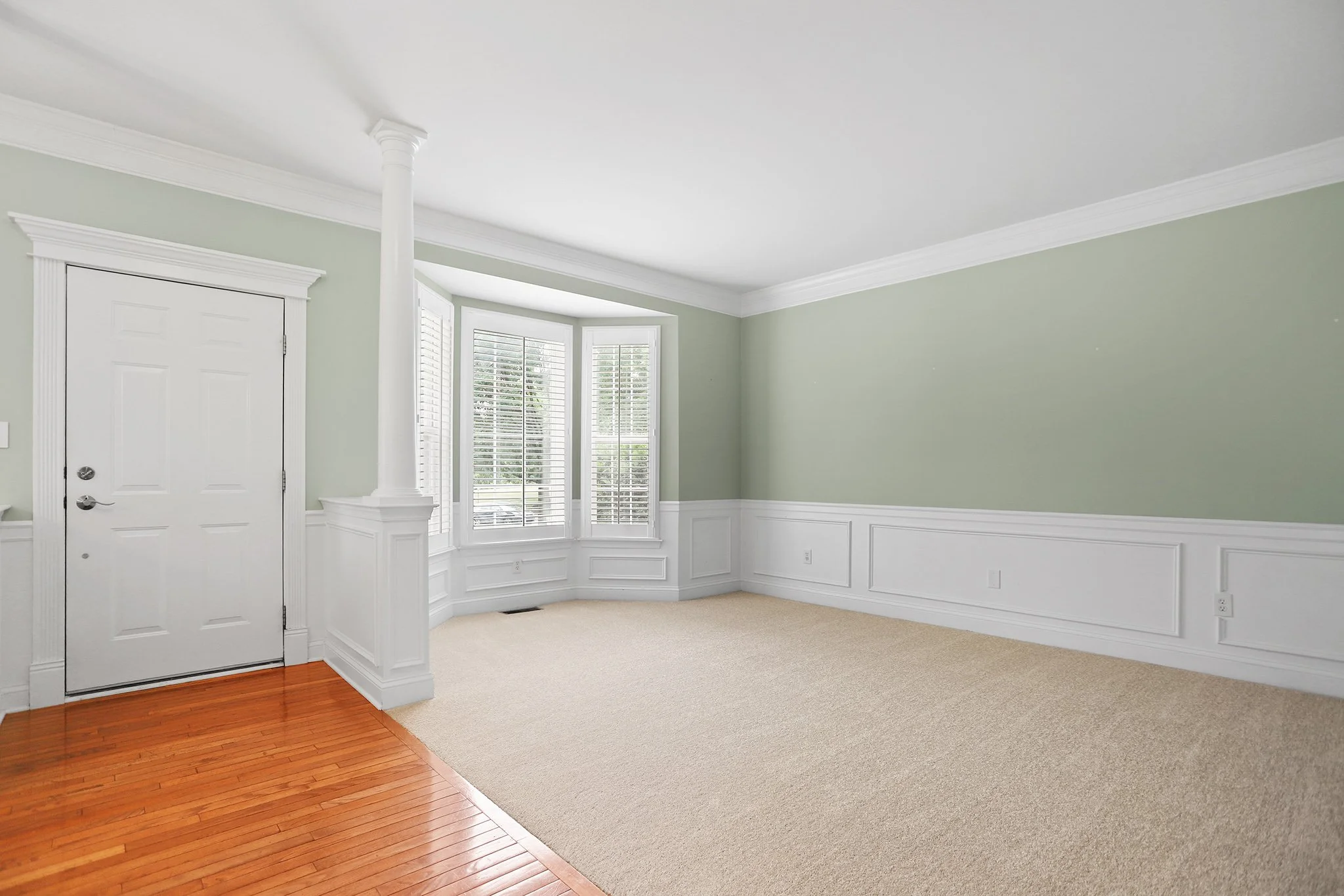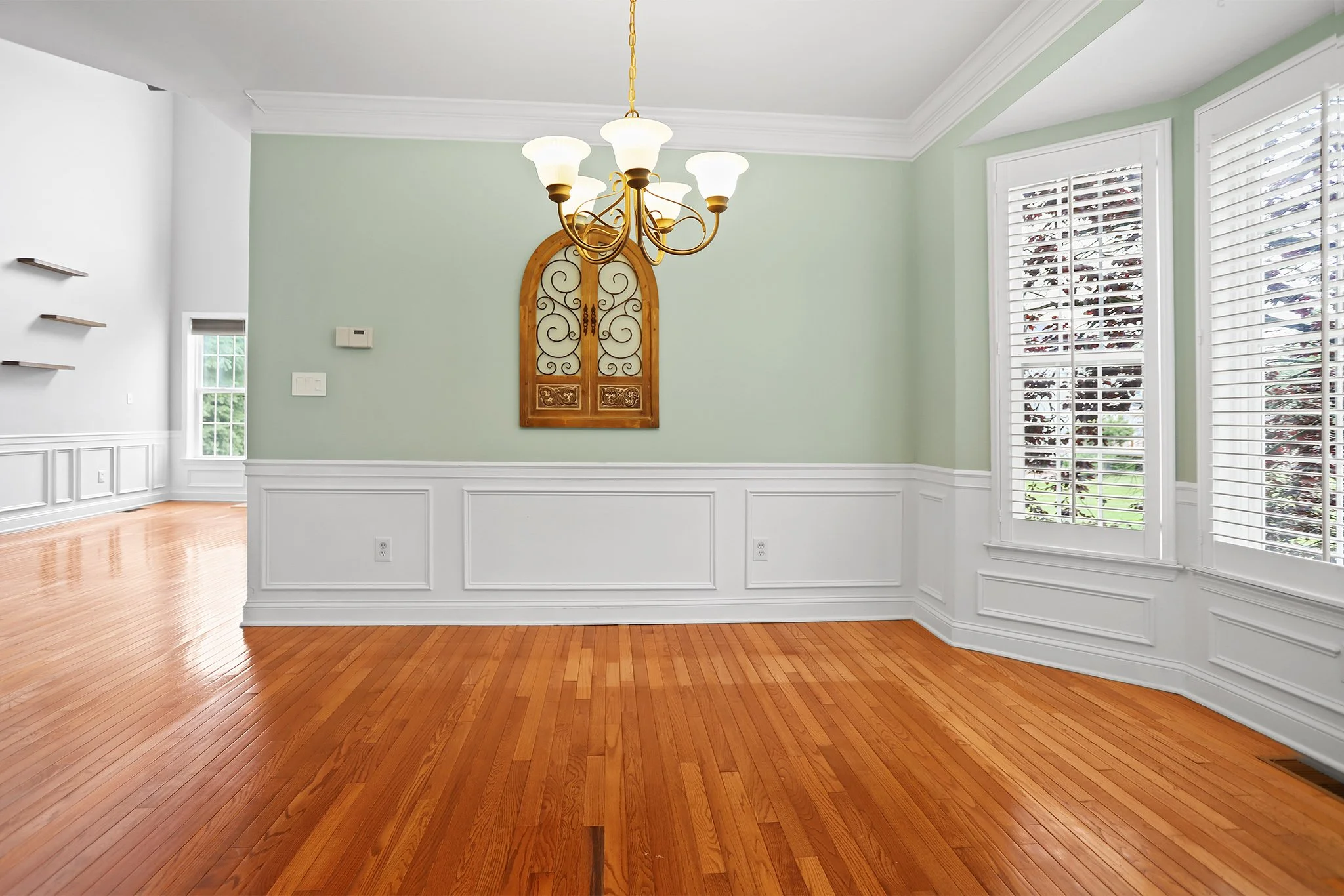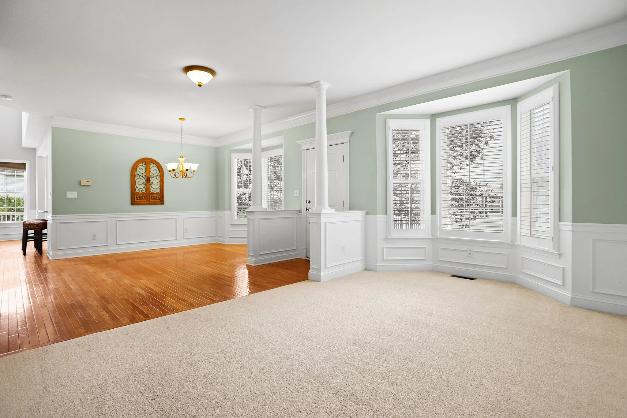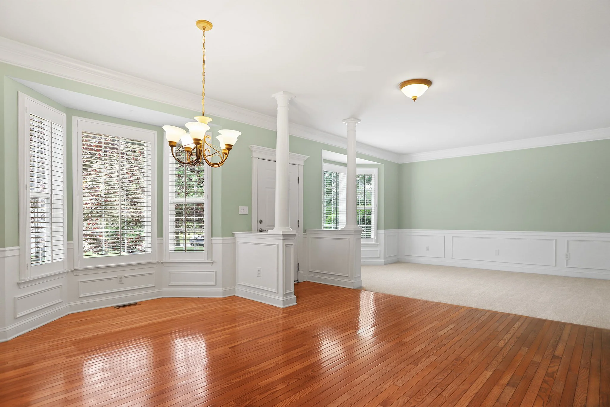 The main level showcases refinished hardwood floors, bay windows with custom Hunter Douglas window treatments in both the living and dining rooms, and a two-story family room with gas fireplace. The kitchen includes 48 in cabinetry, granite countertops, tile flooring, and sliding doors that open to a raised deck—perfect for outdoor entertaining. Also on this level is access to the oversized two car garage and a convenient main floor powder room.
