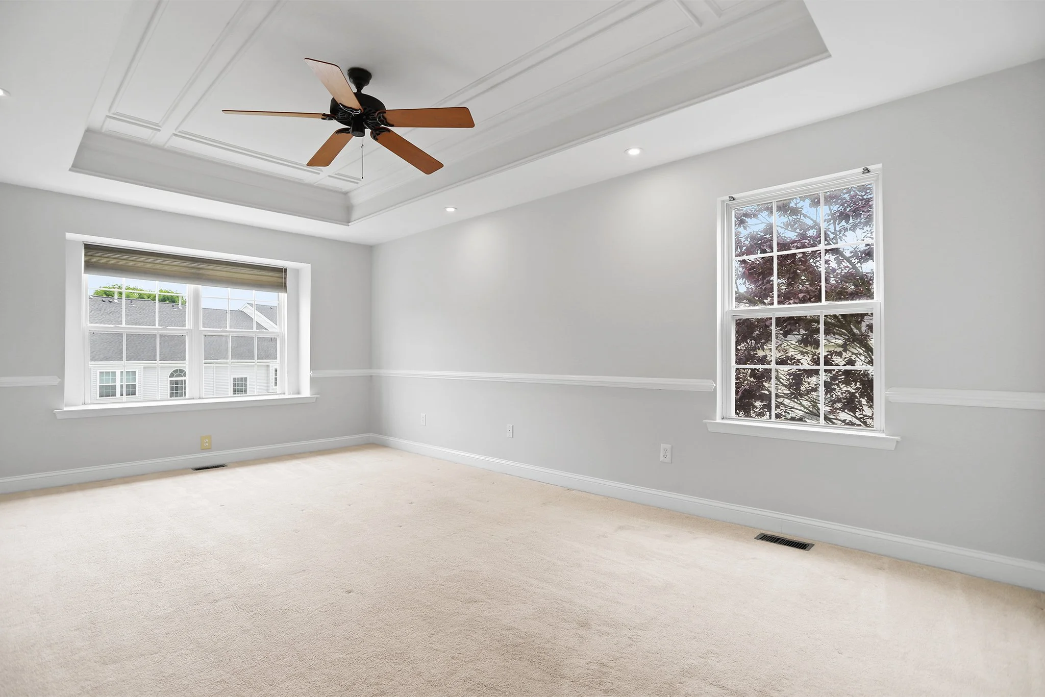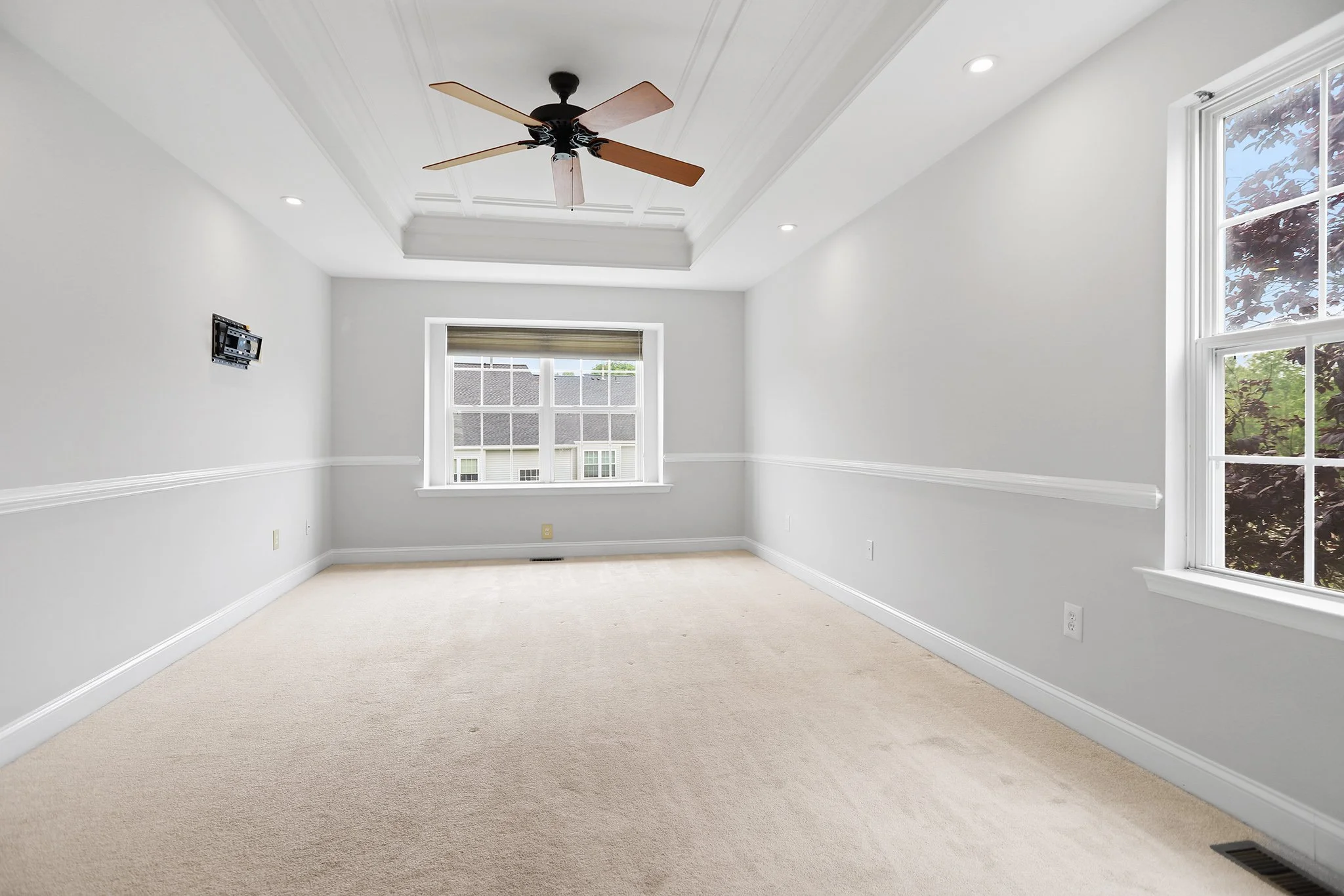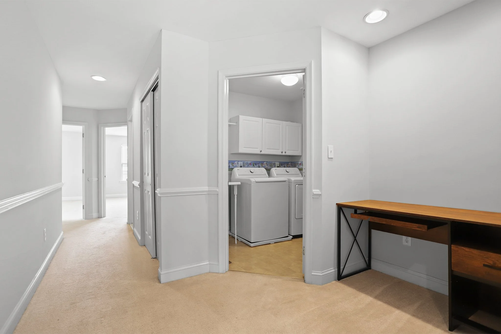 Upstairs, the spacious primary suite includes tray ceiling molding, crown molding, a window seat, two walk-in closets, and two additional double closets. The en-suite bath offers a dual vanity, jetted and separate stall shower. Two additional bedrooms, a full hall bath, a second-floor laundry room with brand new washer and dryer, and a workspace on the open landing complete the upper level.