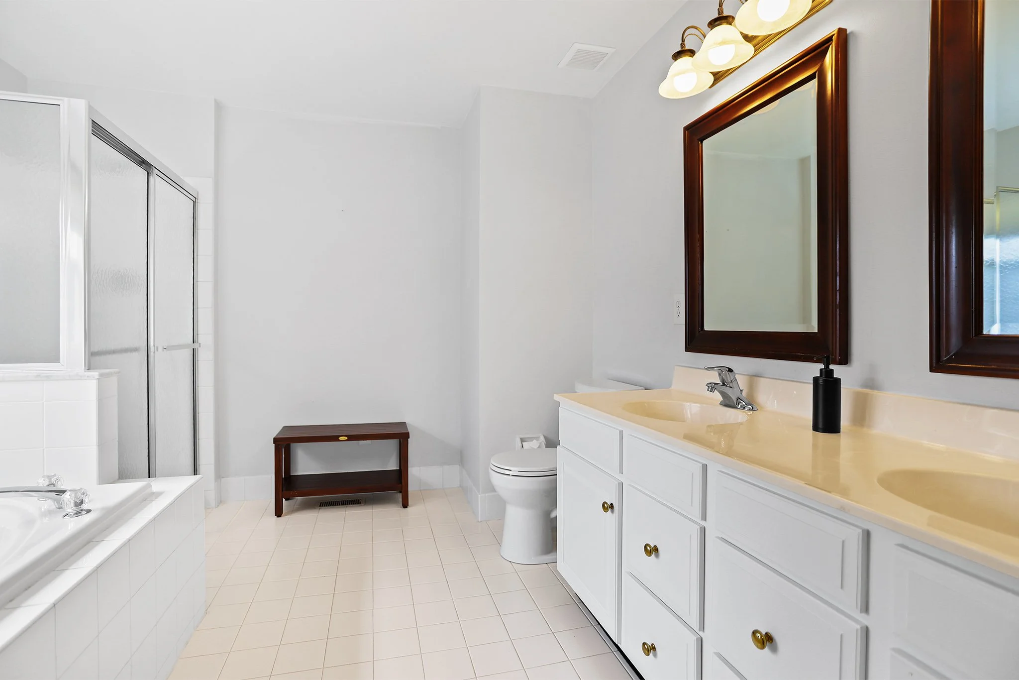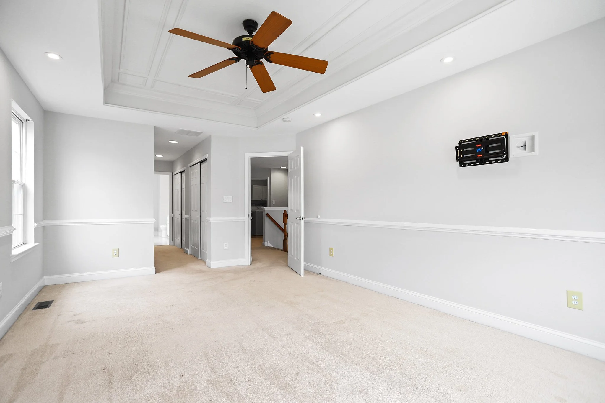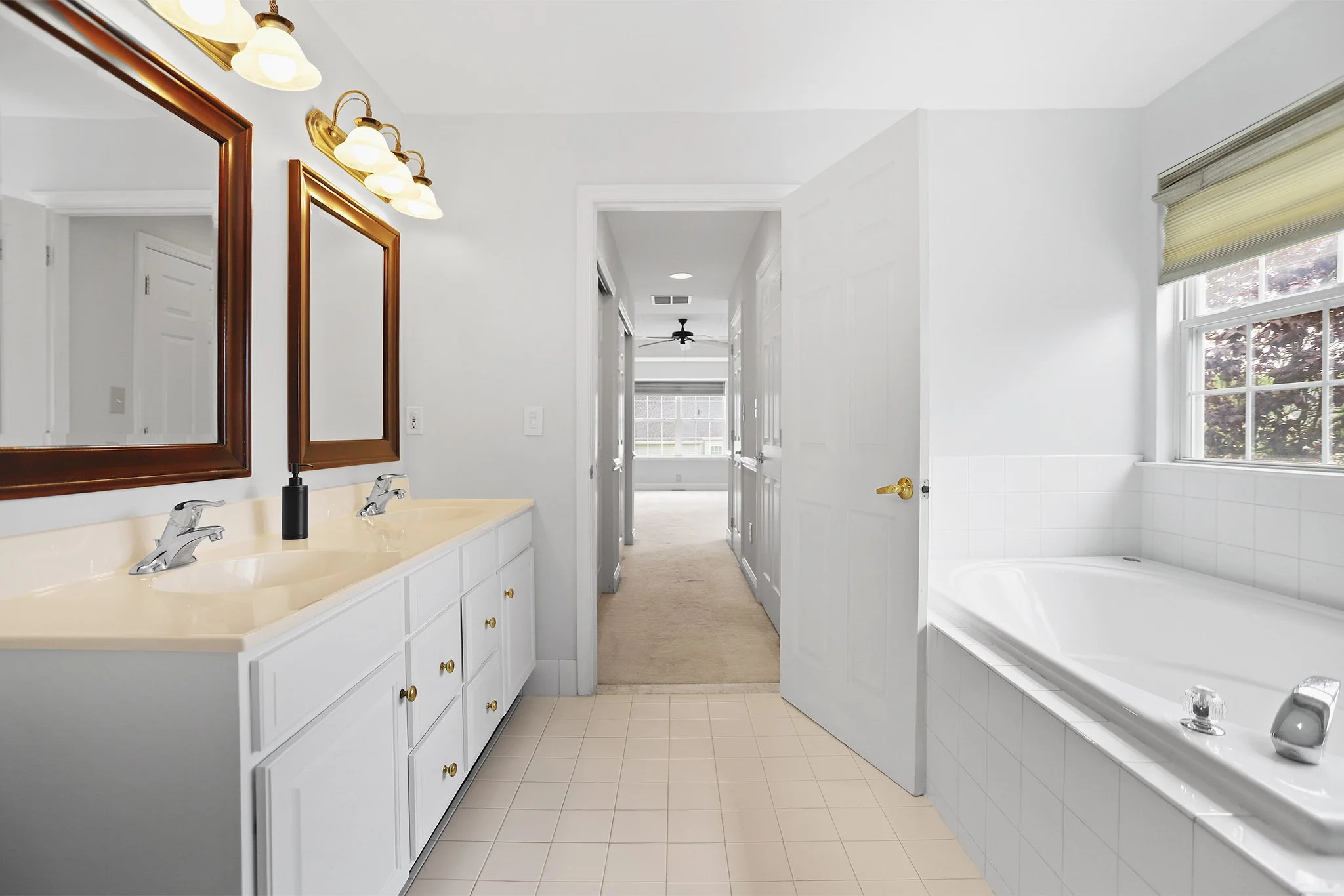 Upstairs, the spacious primary suite includes tray ceiling molding, crown molding, a window seat, two walk-in closets, and two additional double closets. The en-suite bath offers a dual vanity, jetted and separate stall shower. Two additional bedrooms, a full hall bath, a second-floor laundry room with brand new washer and dryer, and a workspace on the open landing complete the upper level.