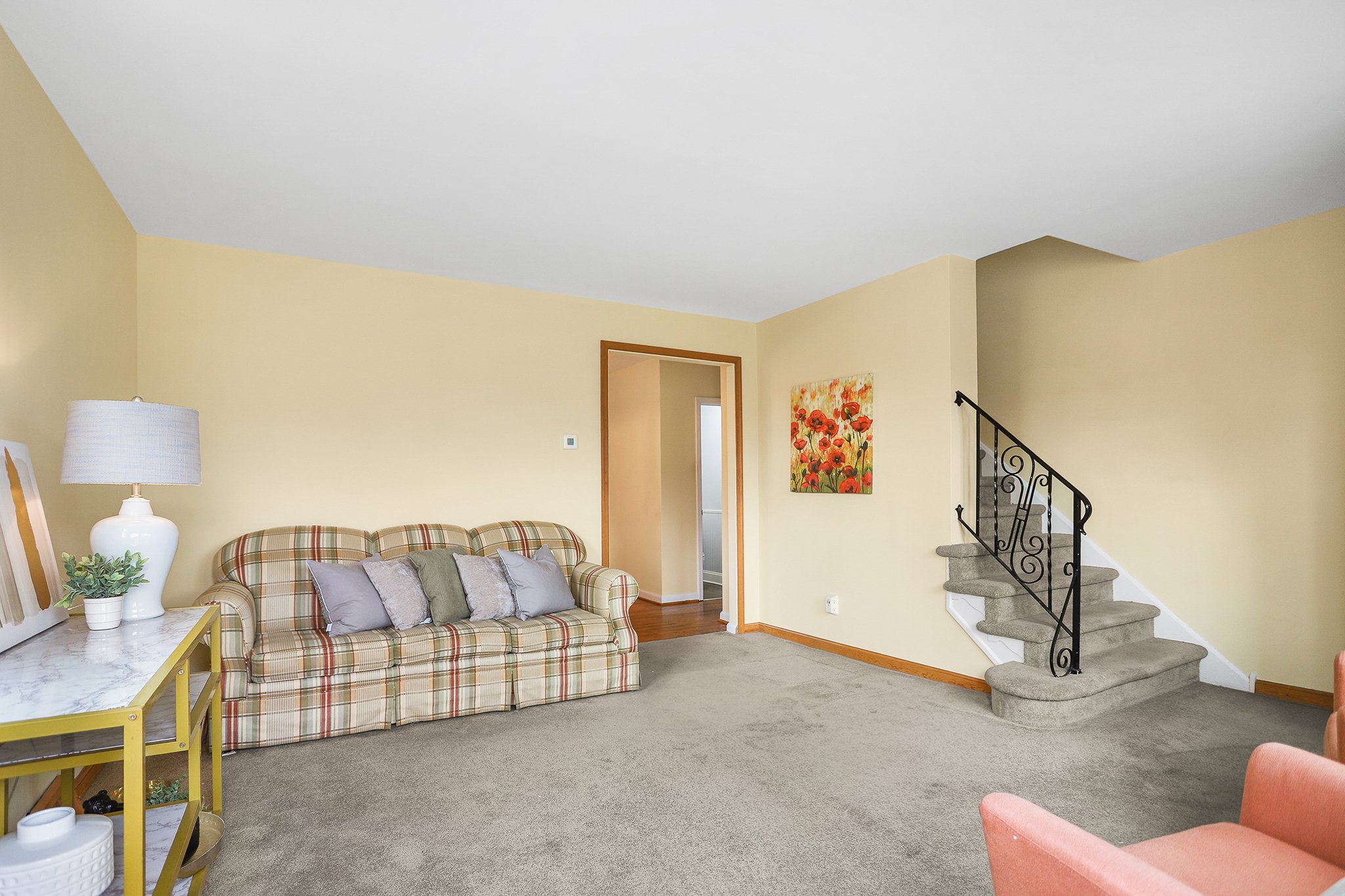 Enter into the living room with plush wall to wall carpeting and three panel bay window that drenches the space in natural light. The main floor flows nicely into the spacious dining area that has a powder room and access to the rec room basement.