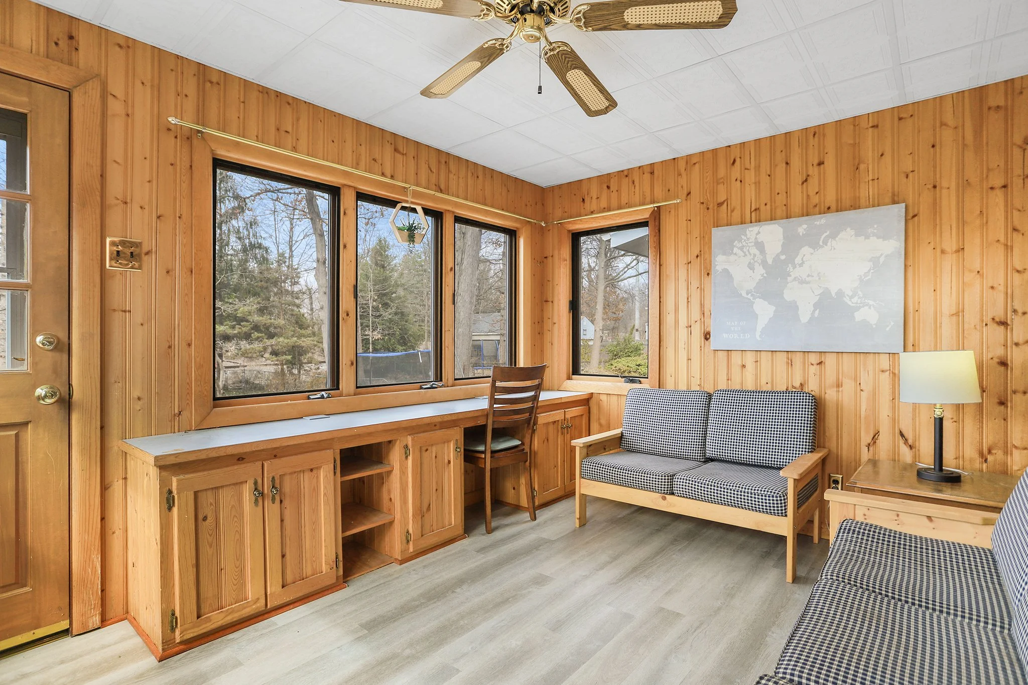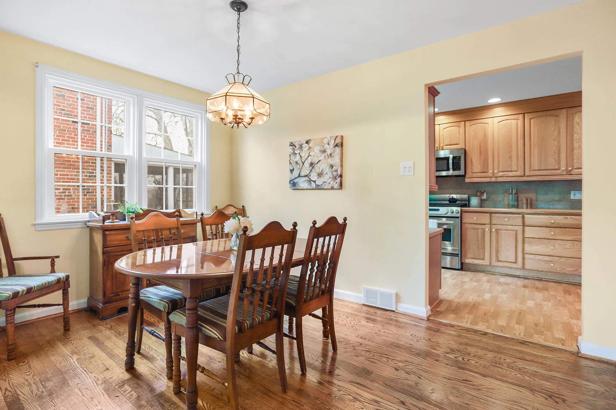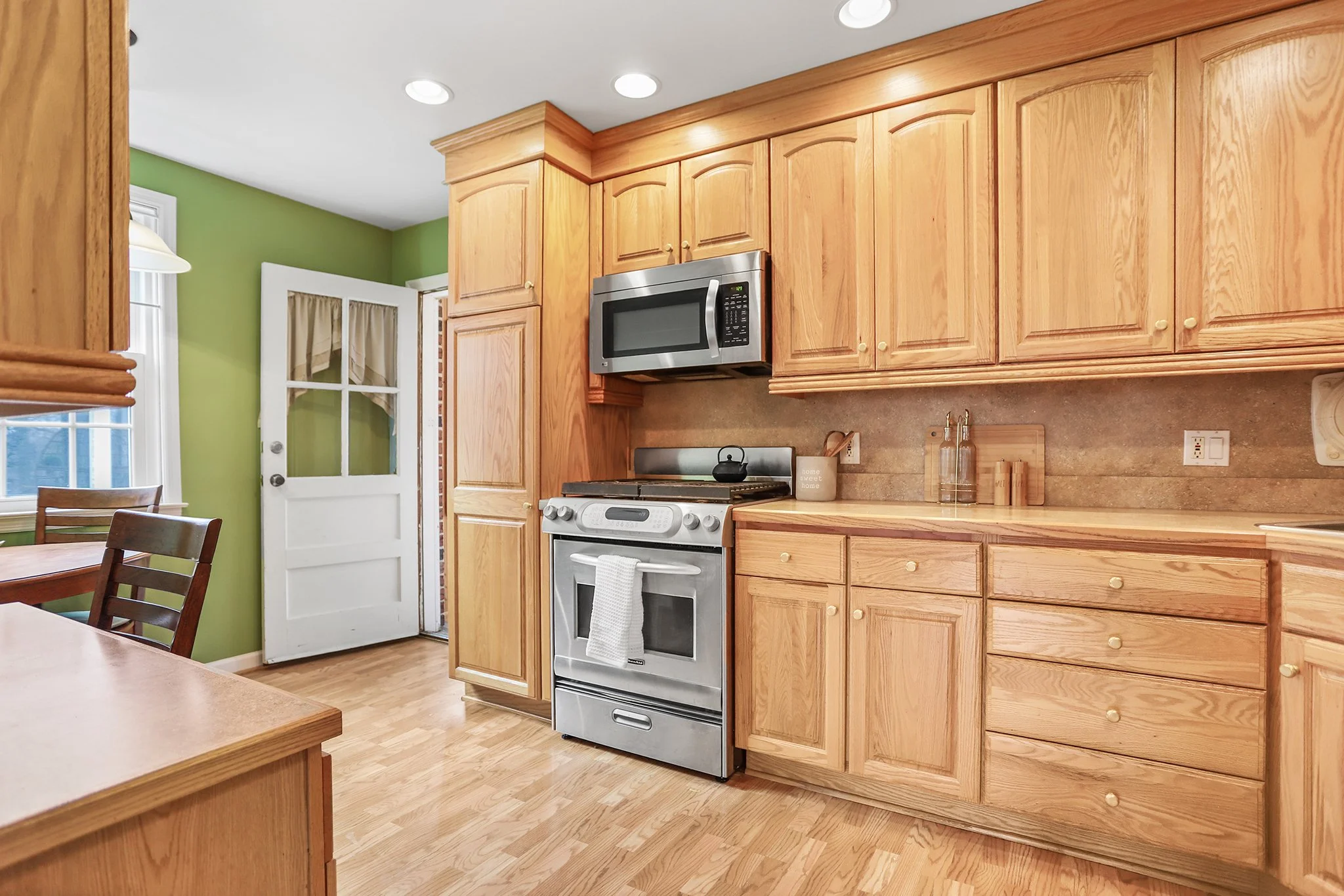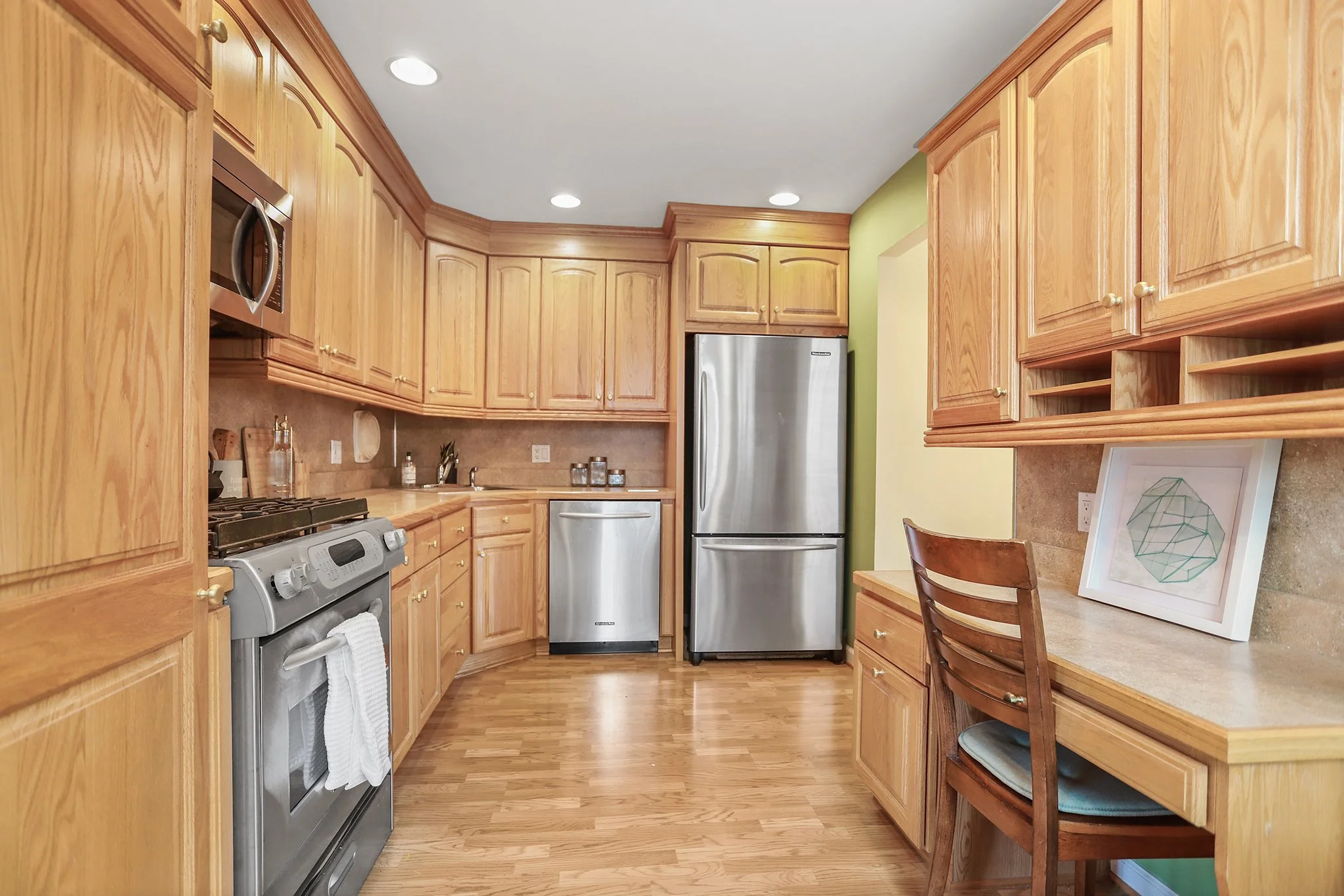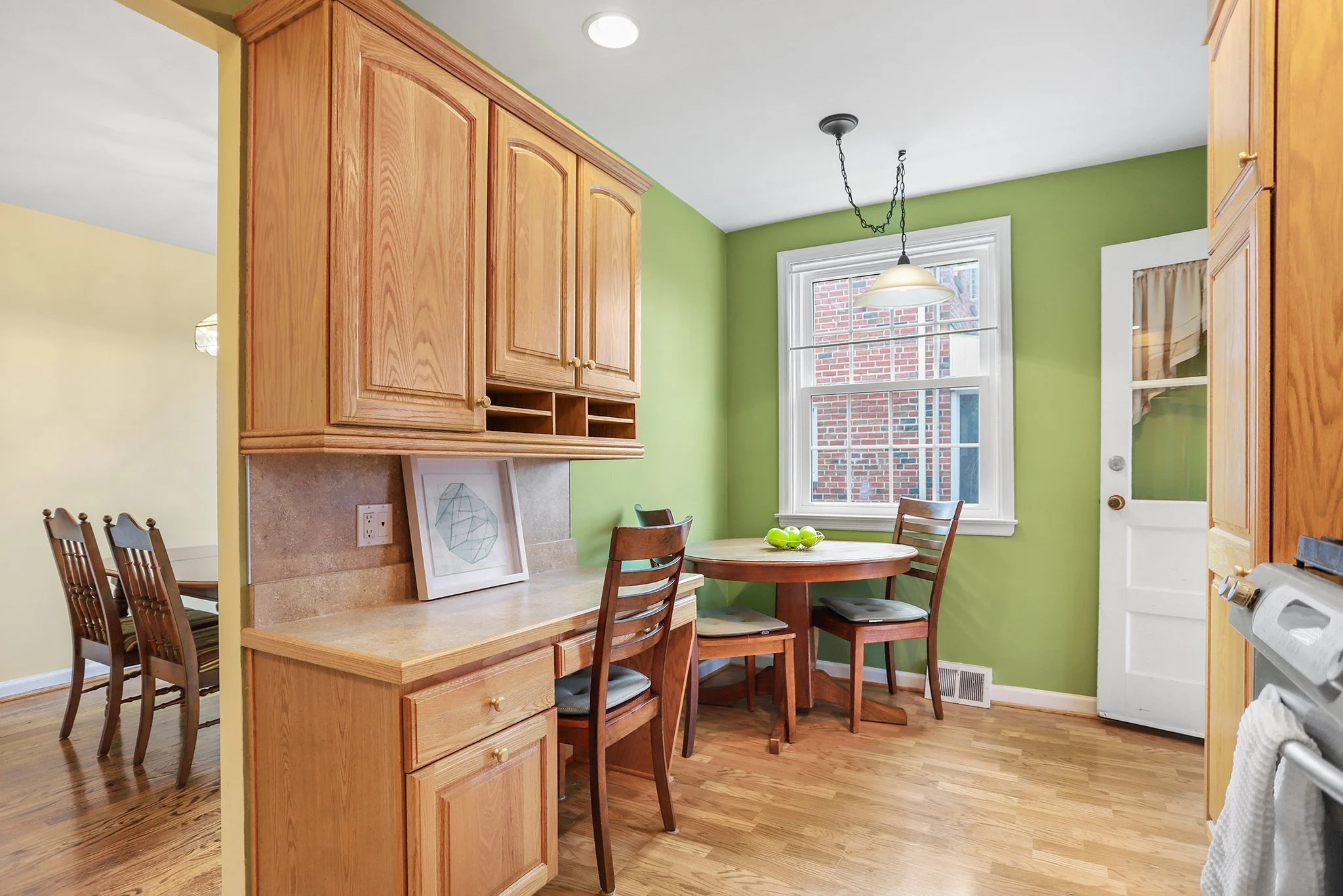 The updated eat-in kitchen is thoughtfully designed to include a desk area and features stainless steel appliances, tons of cabinetry and access to the back porch that has been converted into a den with brick wall facade overlooking the extra large backyard.