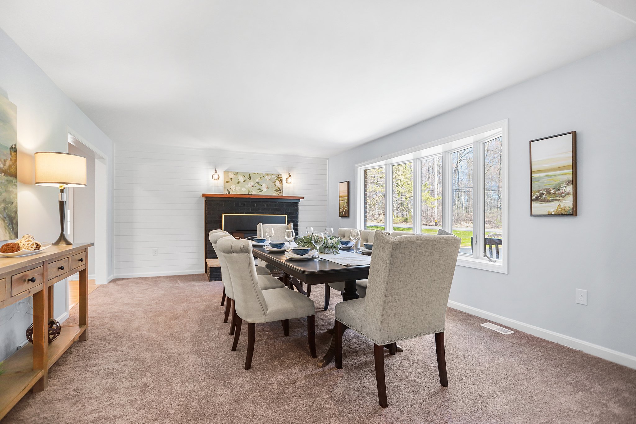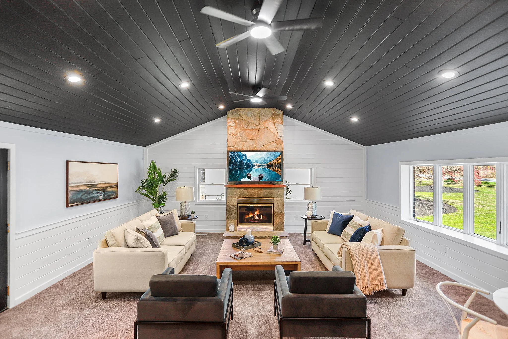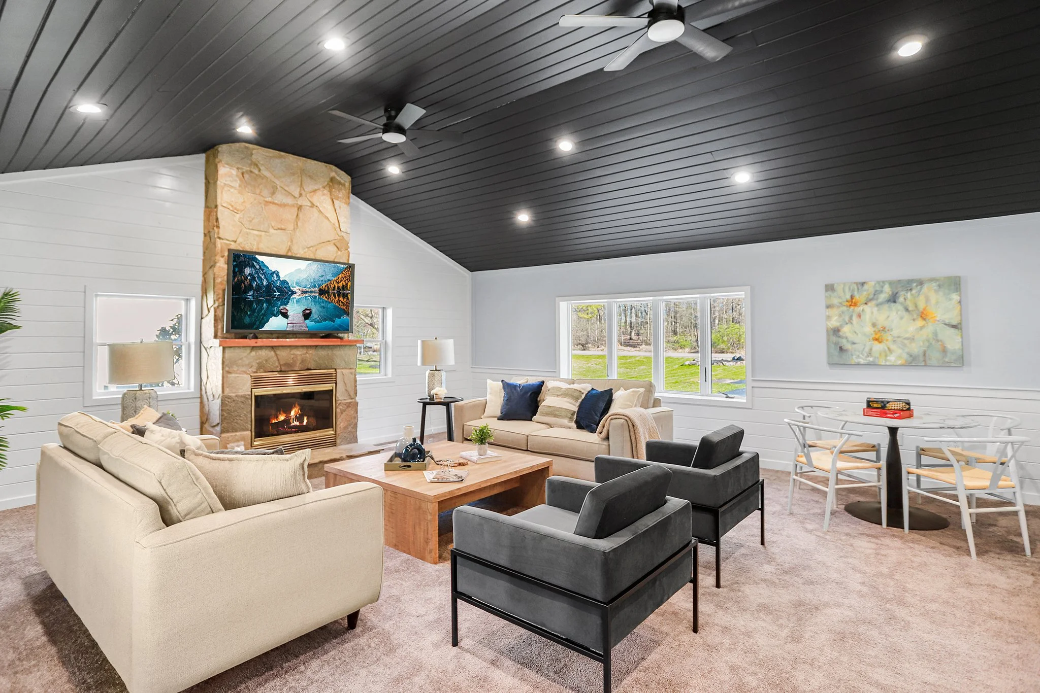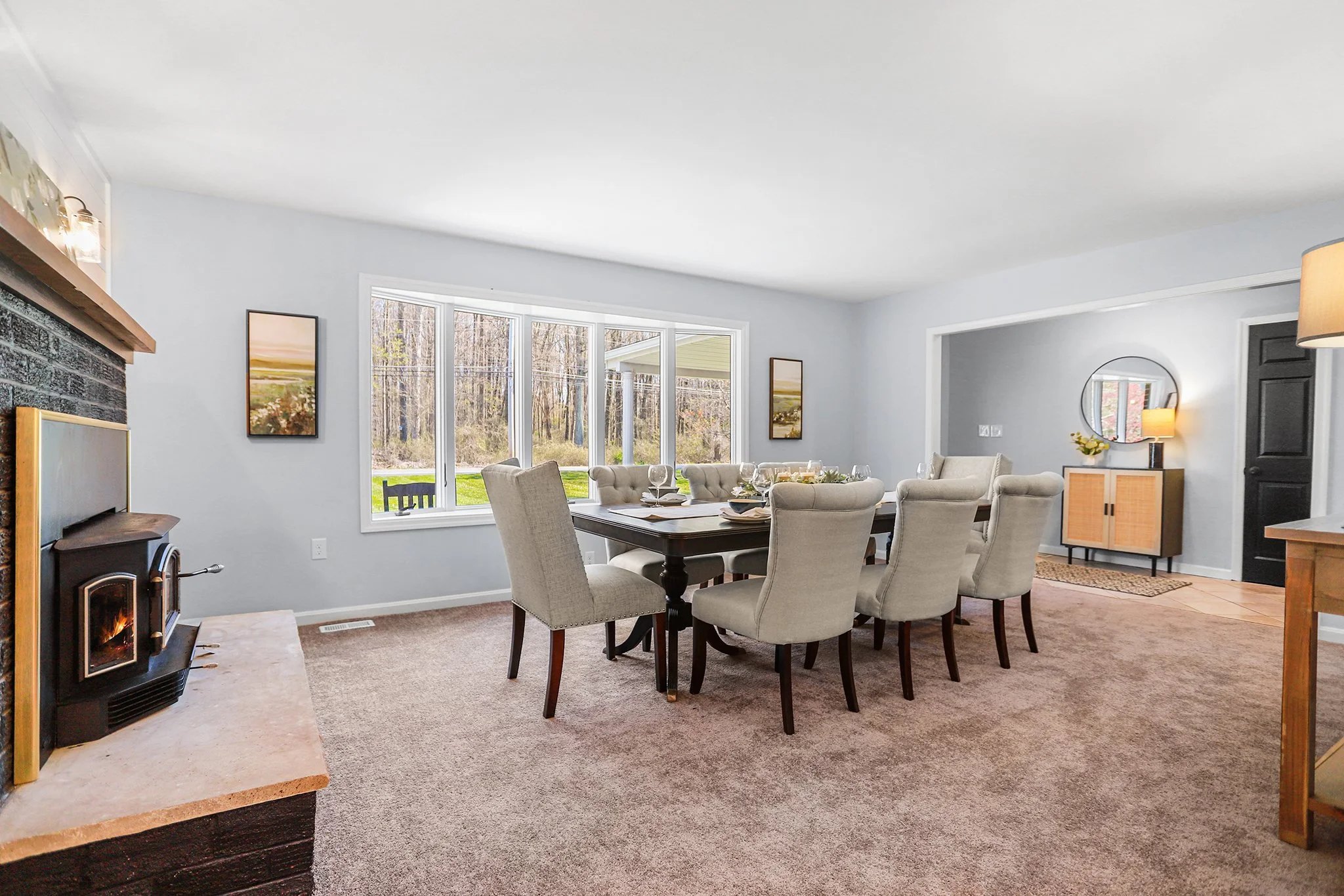 As you step onto the charming front porch, you’ll know this home is special. Inside, the main living areas are light, bright, and inviting. The formal dining space features a brick fireplace painted a contemporary dark grey, framed by crisp white shiplap, warm cove lighting, and a large bay window overlooking the front yard. Just beyond, the sprawling family room addition serves as a dramatic centerpiece, featuring a vaulted ceiling with a deep, dramatic wood plank finish, dynamic recessed lighting, dual ceiling fans, white shiplap walls, and a spectacular stone-faced fireplace with an integrated TV mount. This space also has a secondary wood-burning stove on a raised brick and slate hearth. The large windows look out over the property’s abundant green space.