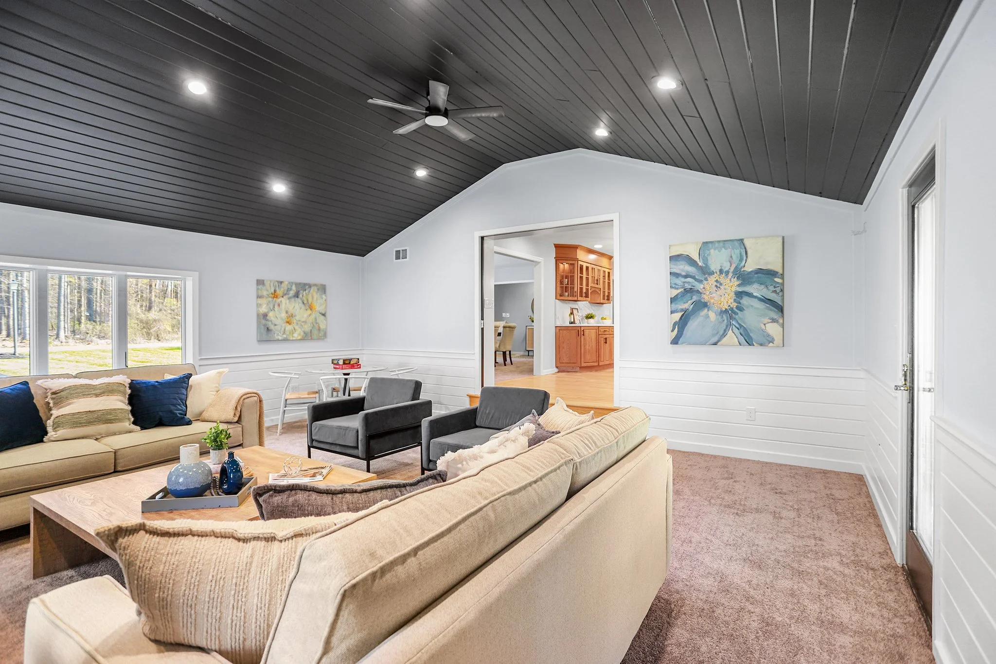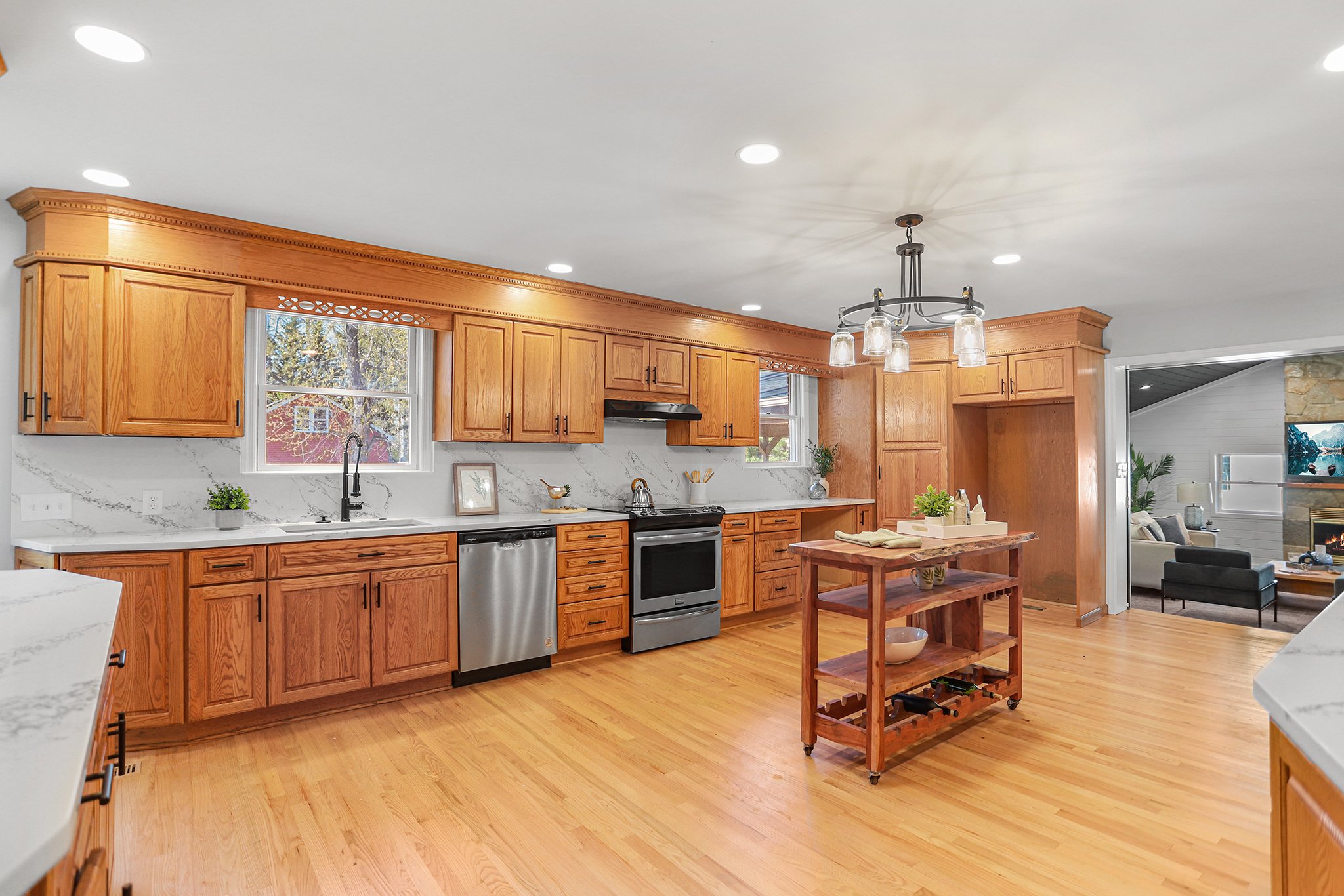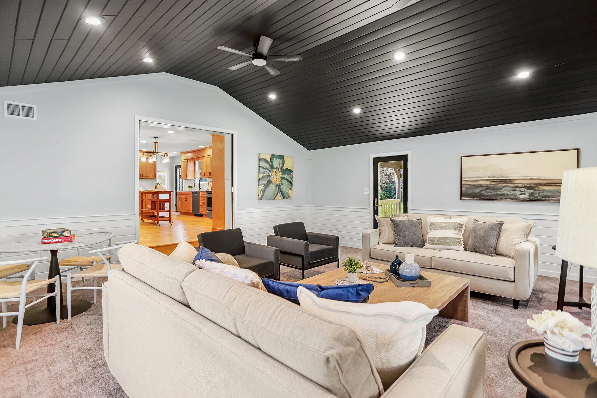 As you step onto the charming front porch, you’ll know this home is special. Inside, the main living areas are light, bright, and inviting. The formal dining space features a brick fireplace painted a contemporary dark grey, framed by crisp white shiplap, warm cove lighting, and a large bay window overlooking the front yard. Just beyond, the sprawling family room addition serves as a dramatic centerpiece, featuring a vaulted ceiling with a deep, dramatic wood plank finish, dynamic recessed lighting, dual ceiling fans, white shiplap walls, and a spectacular stone-faced fireplace with an integrated TV mount. This space also has a secondary wood-burning stove on a raised brick and slate hearth. The large windows look out over the property’s abundant green space.