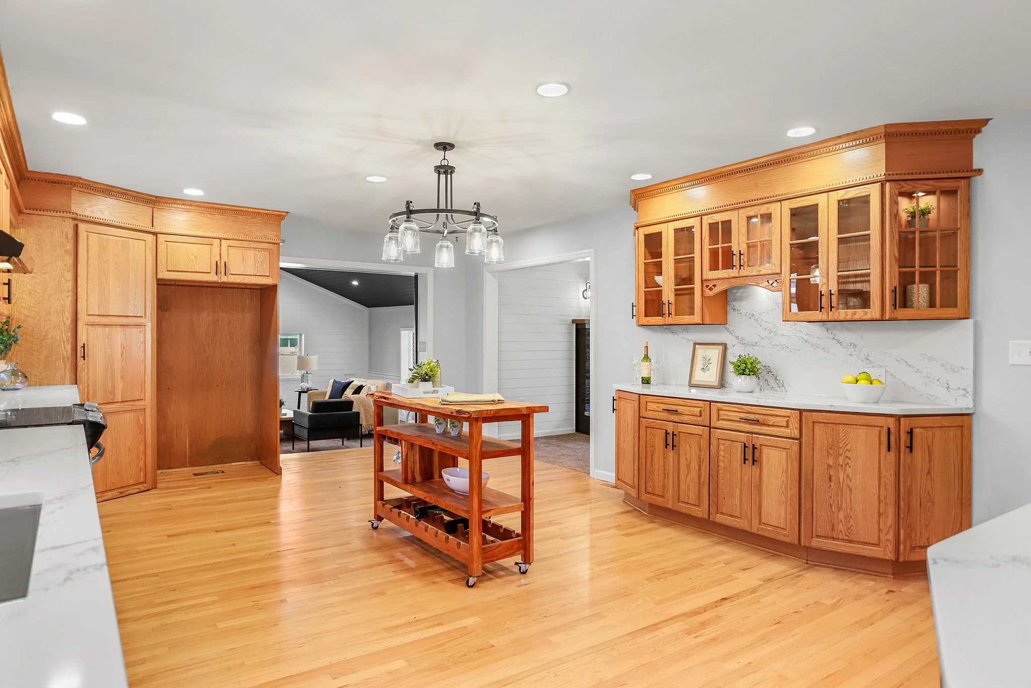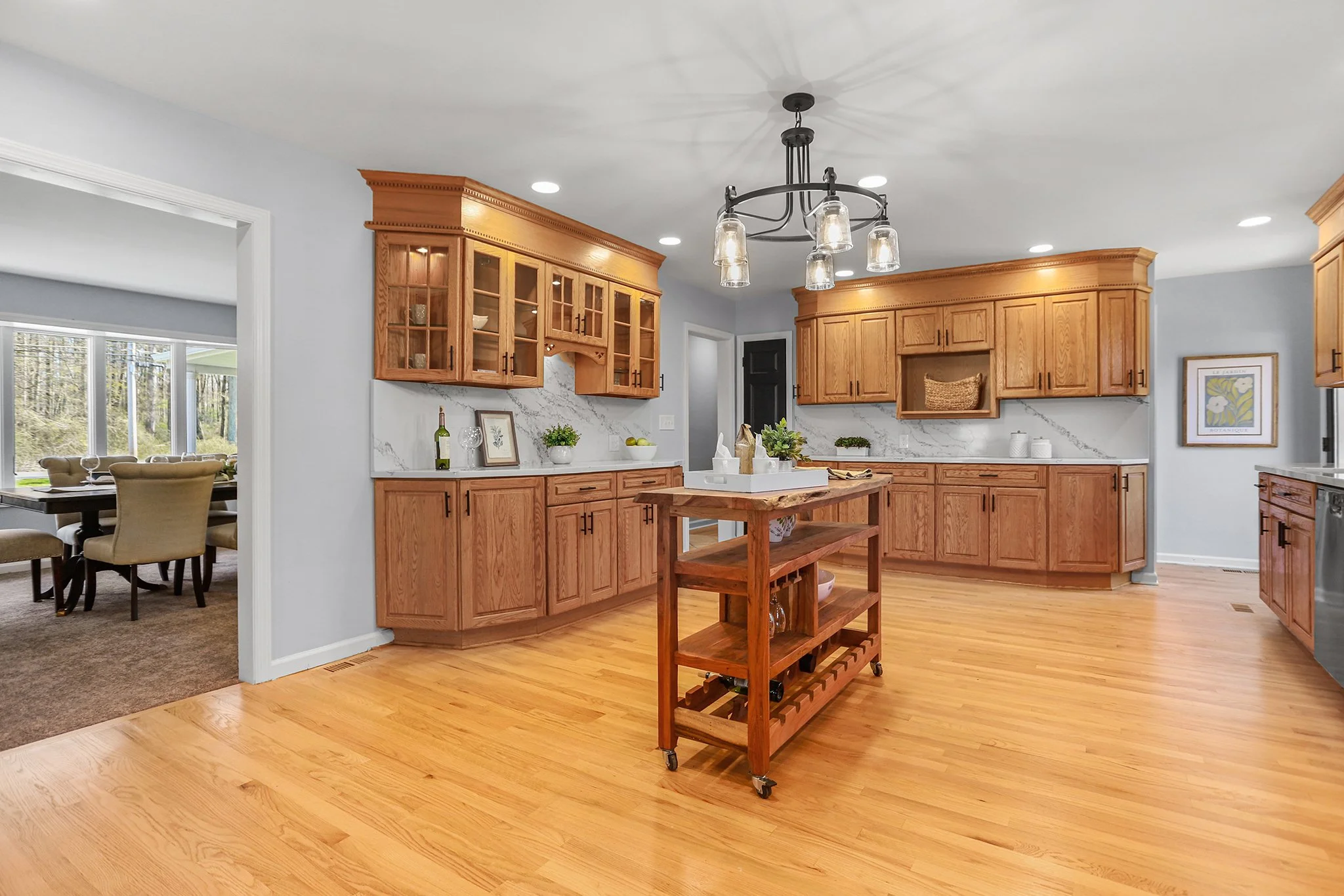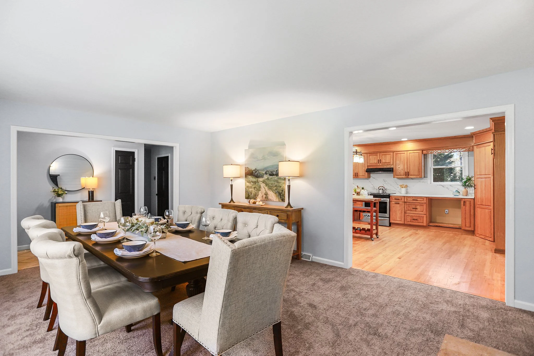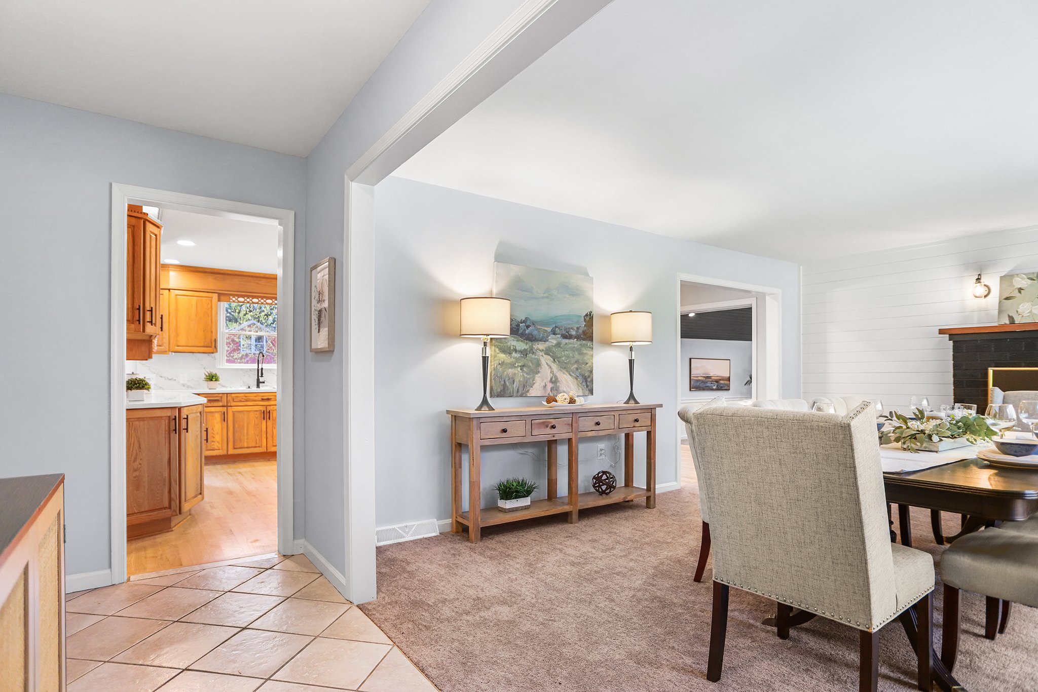 As you step onto the charming front porch, you’ll know this home is special. Inside, the main living areas are light, bright, and inviting. The formal dining space features a brick fireplace painted a contemporary dark grey, framed by crisp white shiplap, warm cove lighting, and a large bay window overlooking the front yard. Just beyond, the sprawling family room addition serves as a dramatic centerpiece, featuring a vaulted ceiling with a deep, dramatic wood plank finish, dynamic recessed lighting, dual ceiling fans, white shiplap walls, and a spectacular stone-faced fireplace with an integrated TV mount. This space also has a secondary wood-burning stove on a raised brick and slate hearth. The large windows look out over the property’s abundant green space.