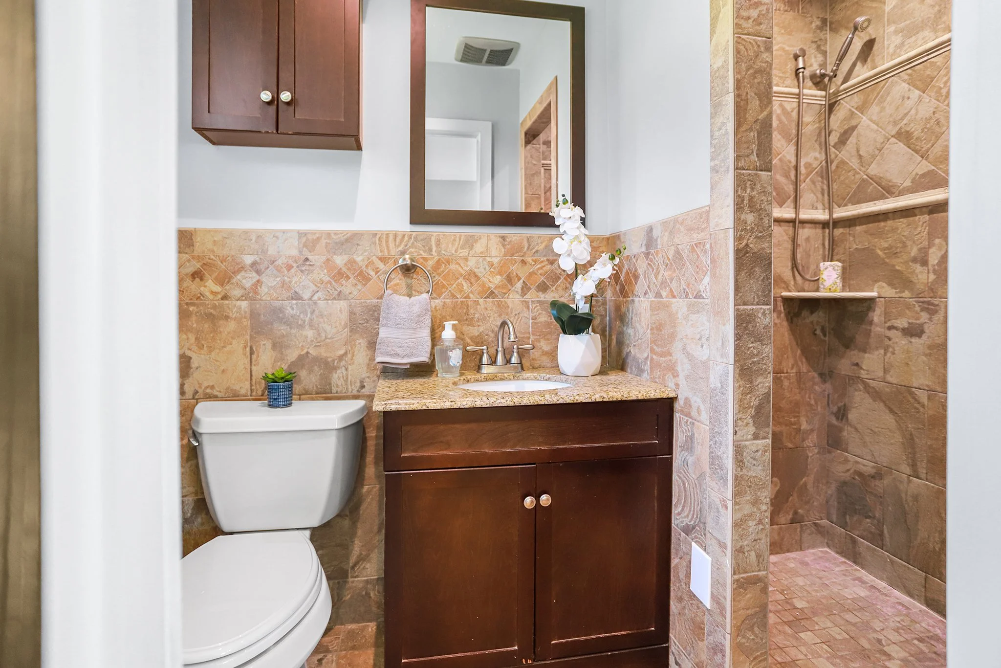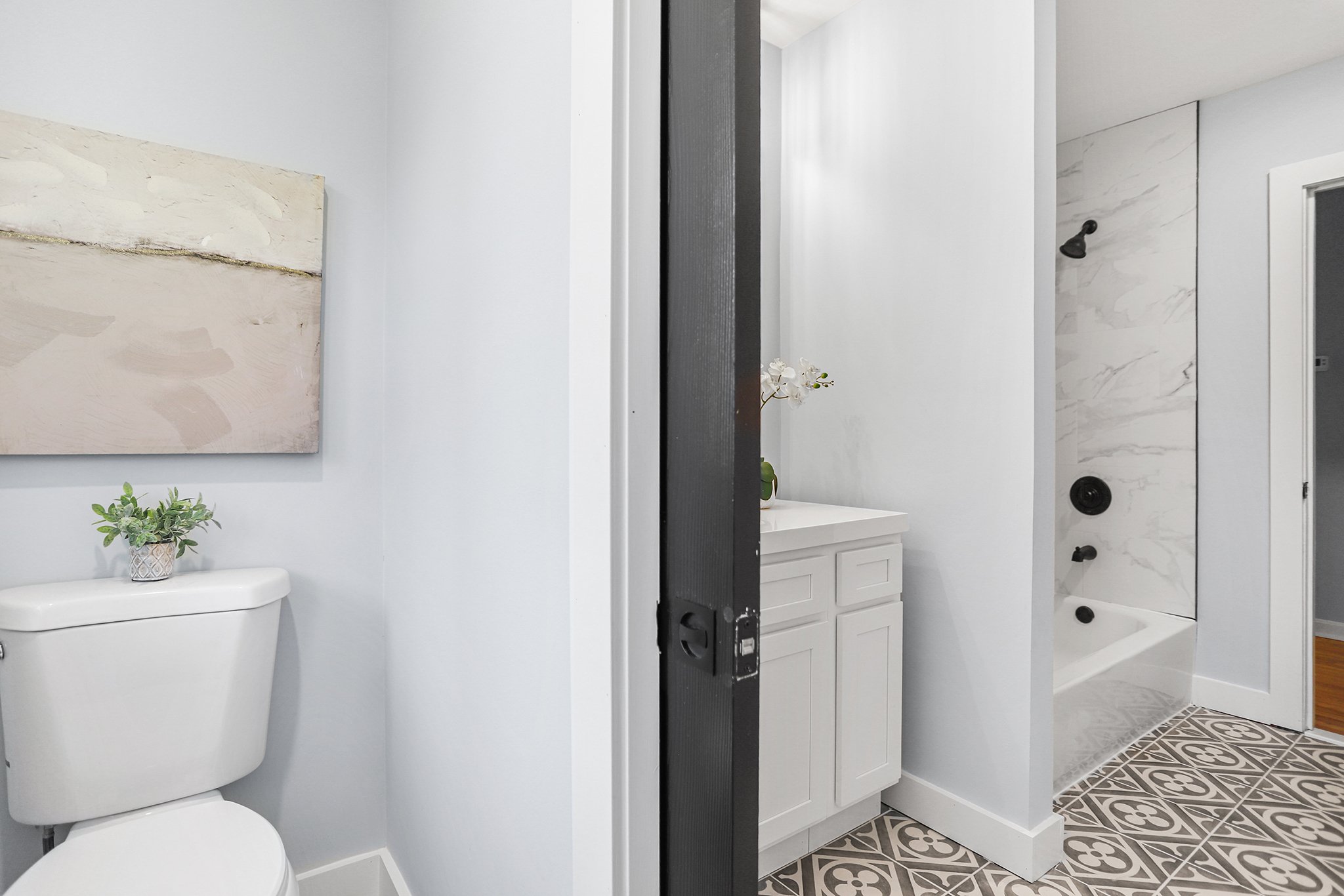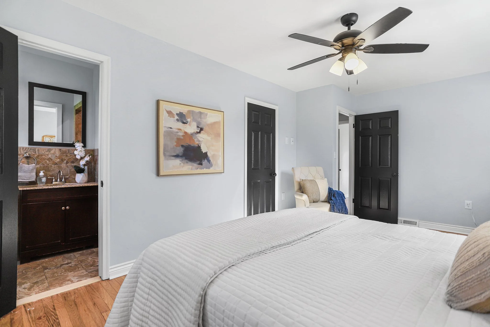 The heart of the home is the thoughtfully designed eat-in kitchen, boasting ample oak cabinetry, high-end marble-patterned quartz countertops, sleek black-accented hardware, and stainless steel appliances. The thoughtfully configured 3-bedroom layout includes a peaceful primary suite served by its own private ensuite bathroom.