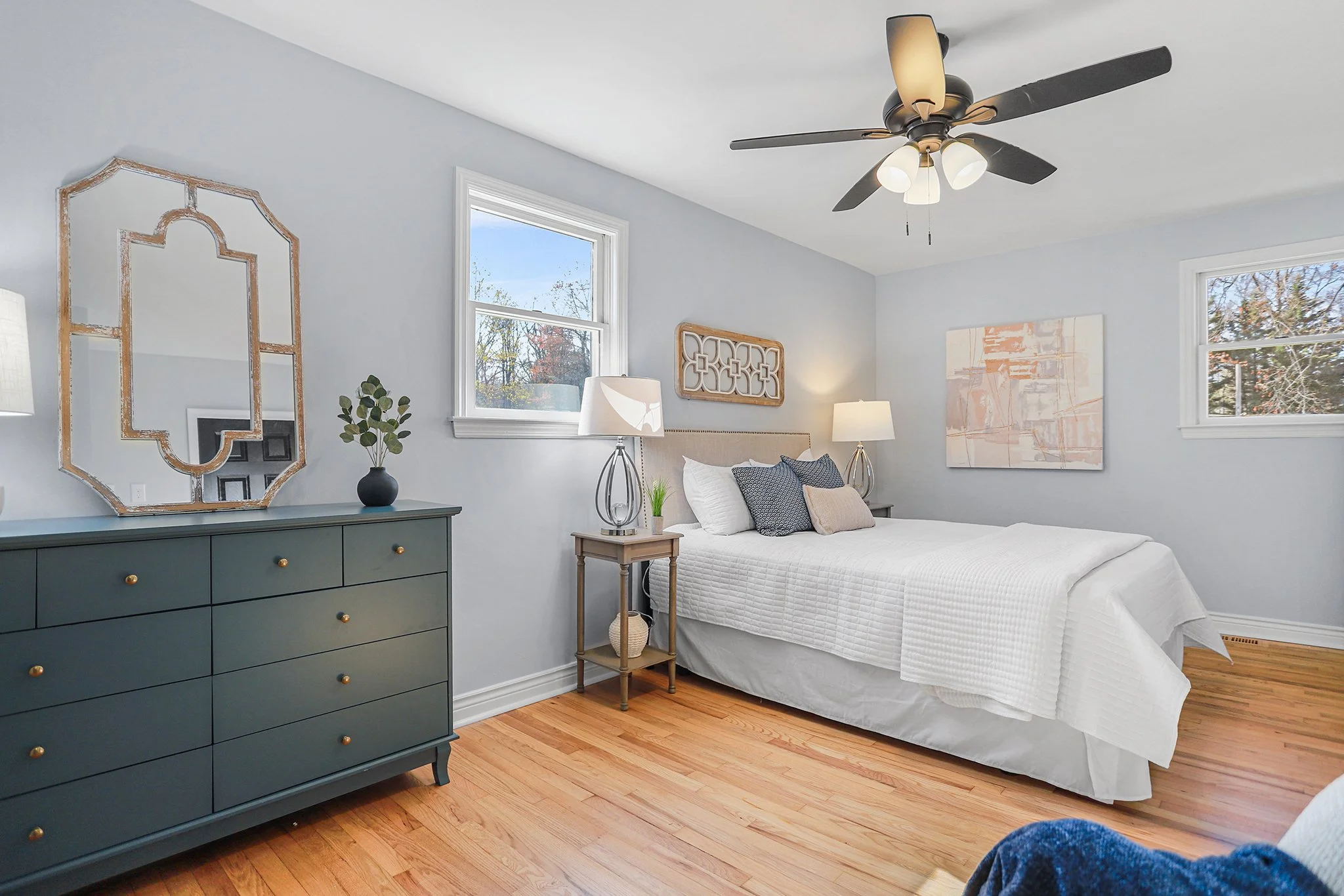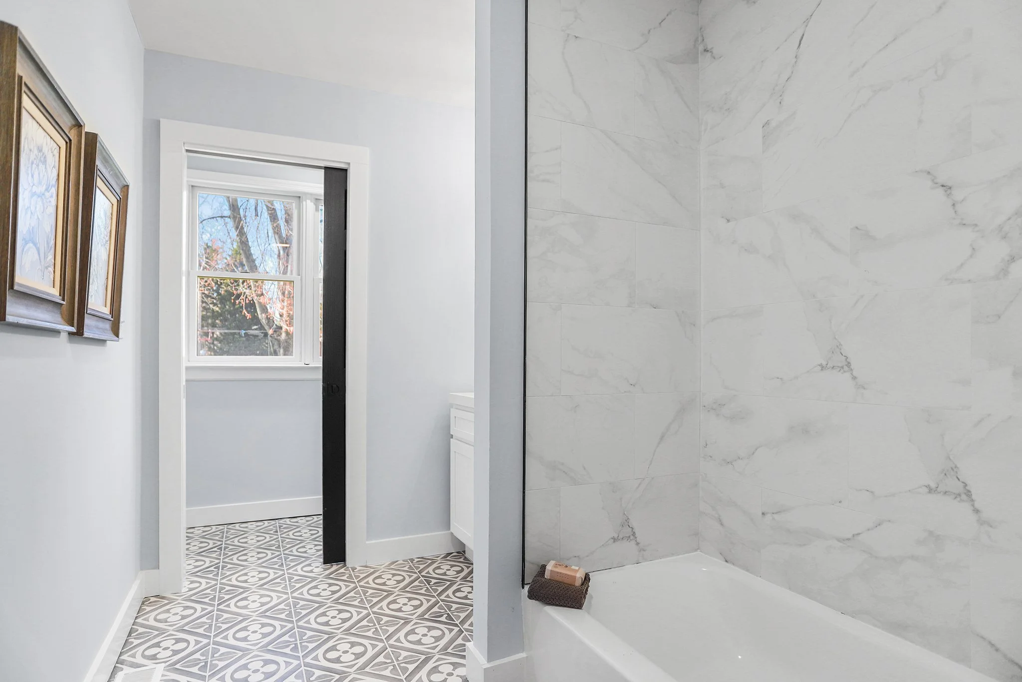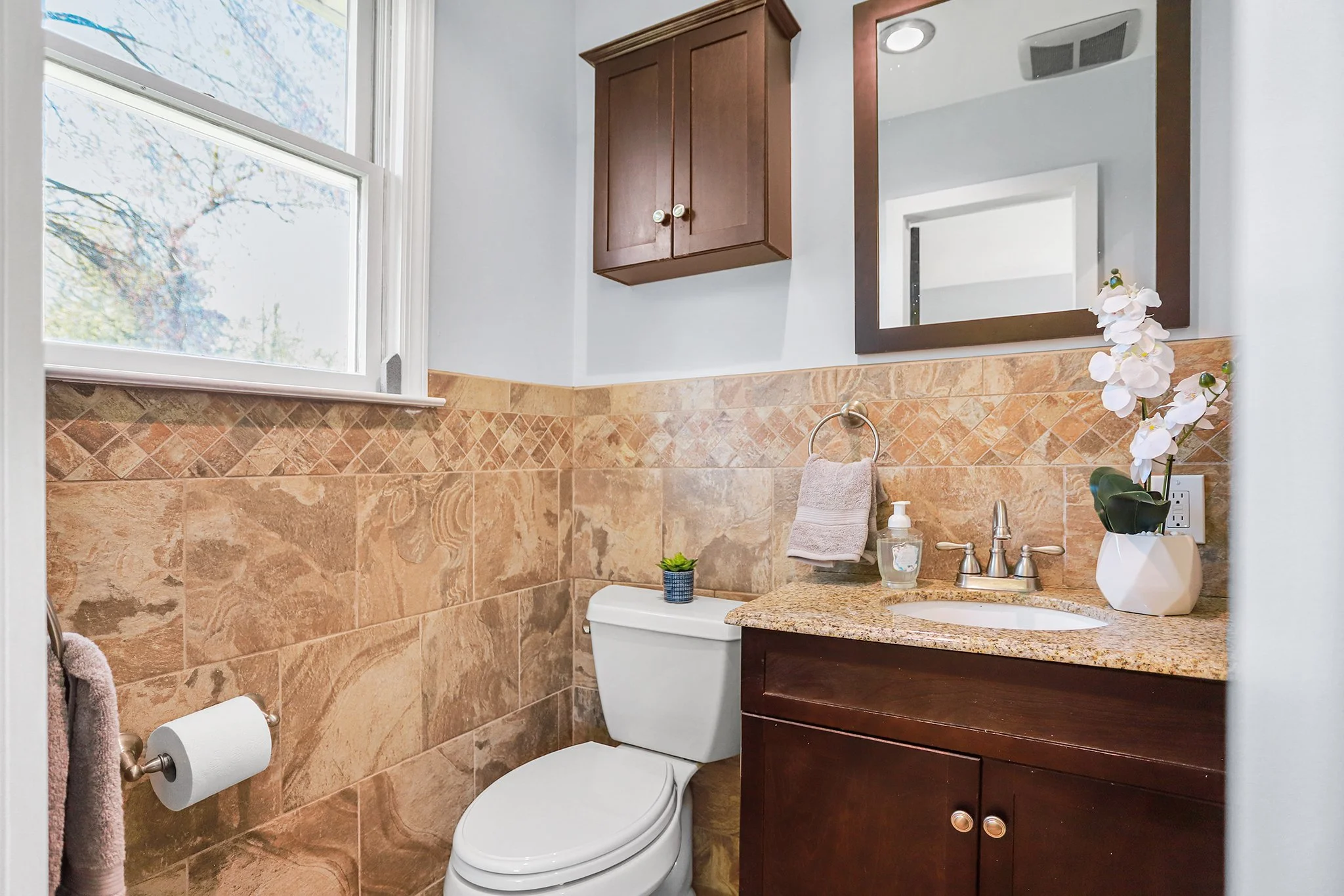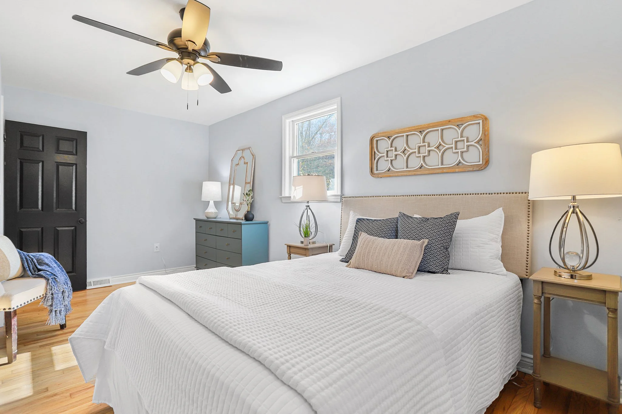 The heart of the home is the thoughtfully designed eat-in kitchen, boasting ample oak cabinetry, high-end marble-patterned quartz countertops, sleek black-accented hardware, and stainless steel appliances. The thoughtfully configured 3-bedroom layout includes a peaceful primary suite served by its own private ensuite bathroom.