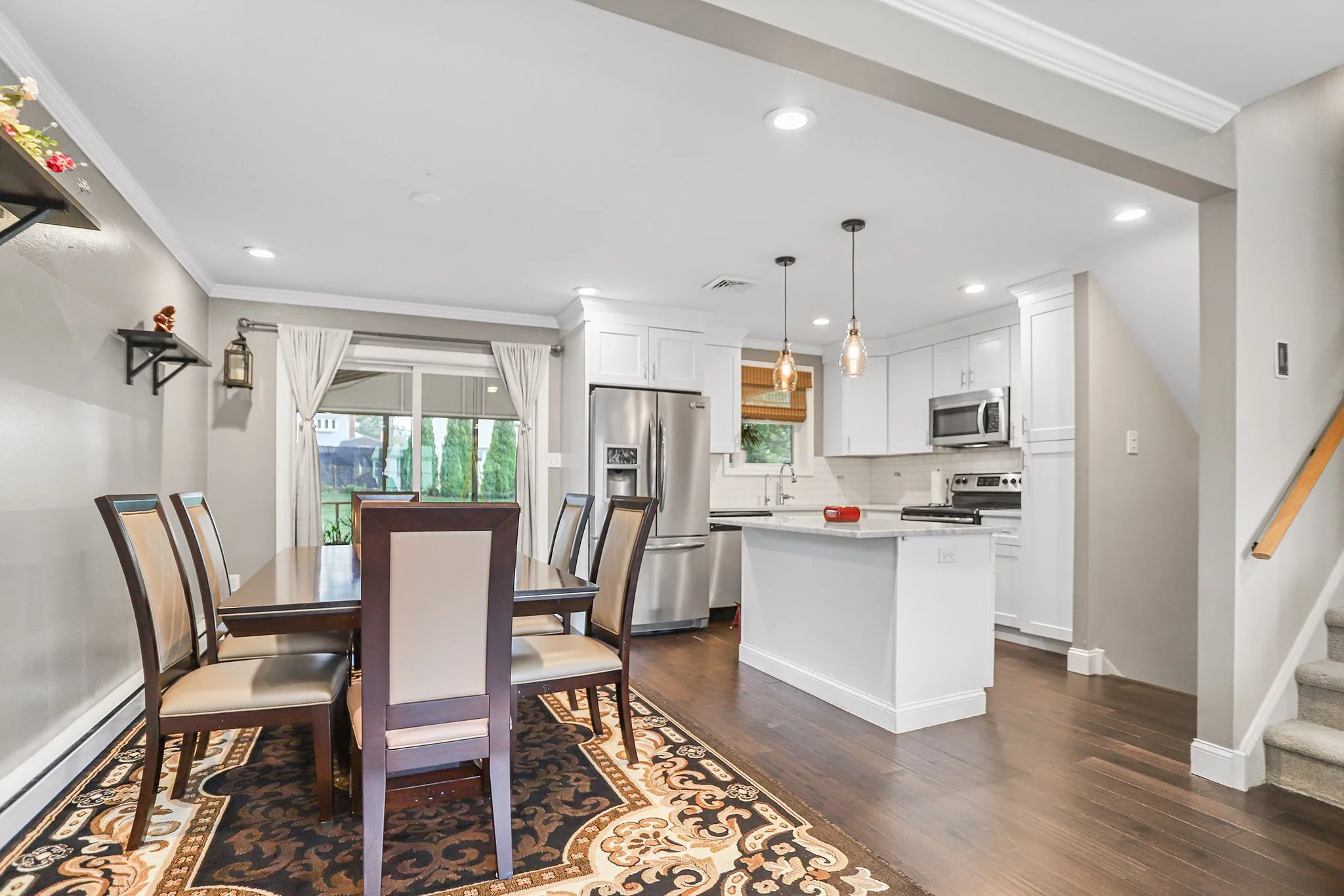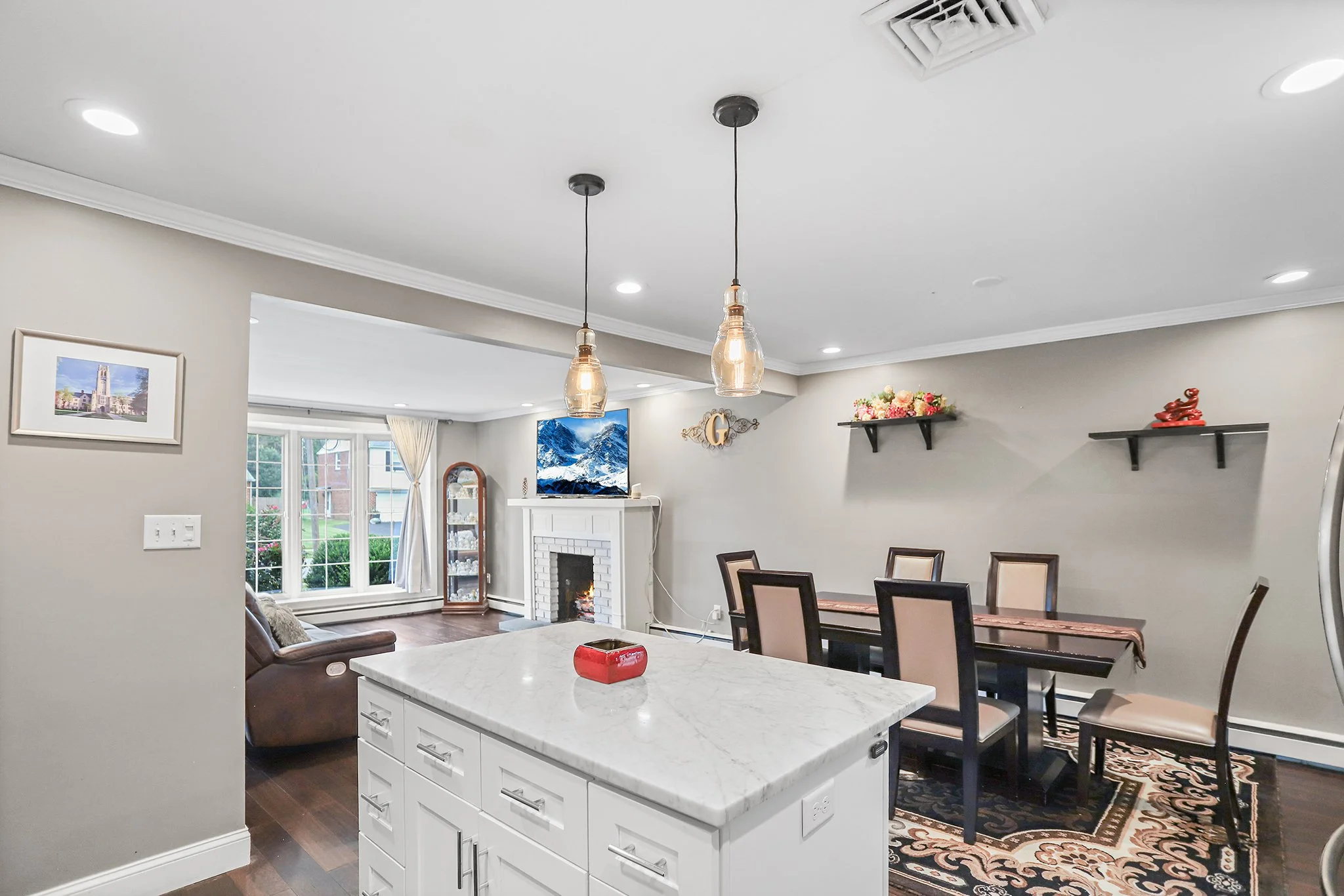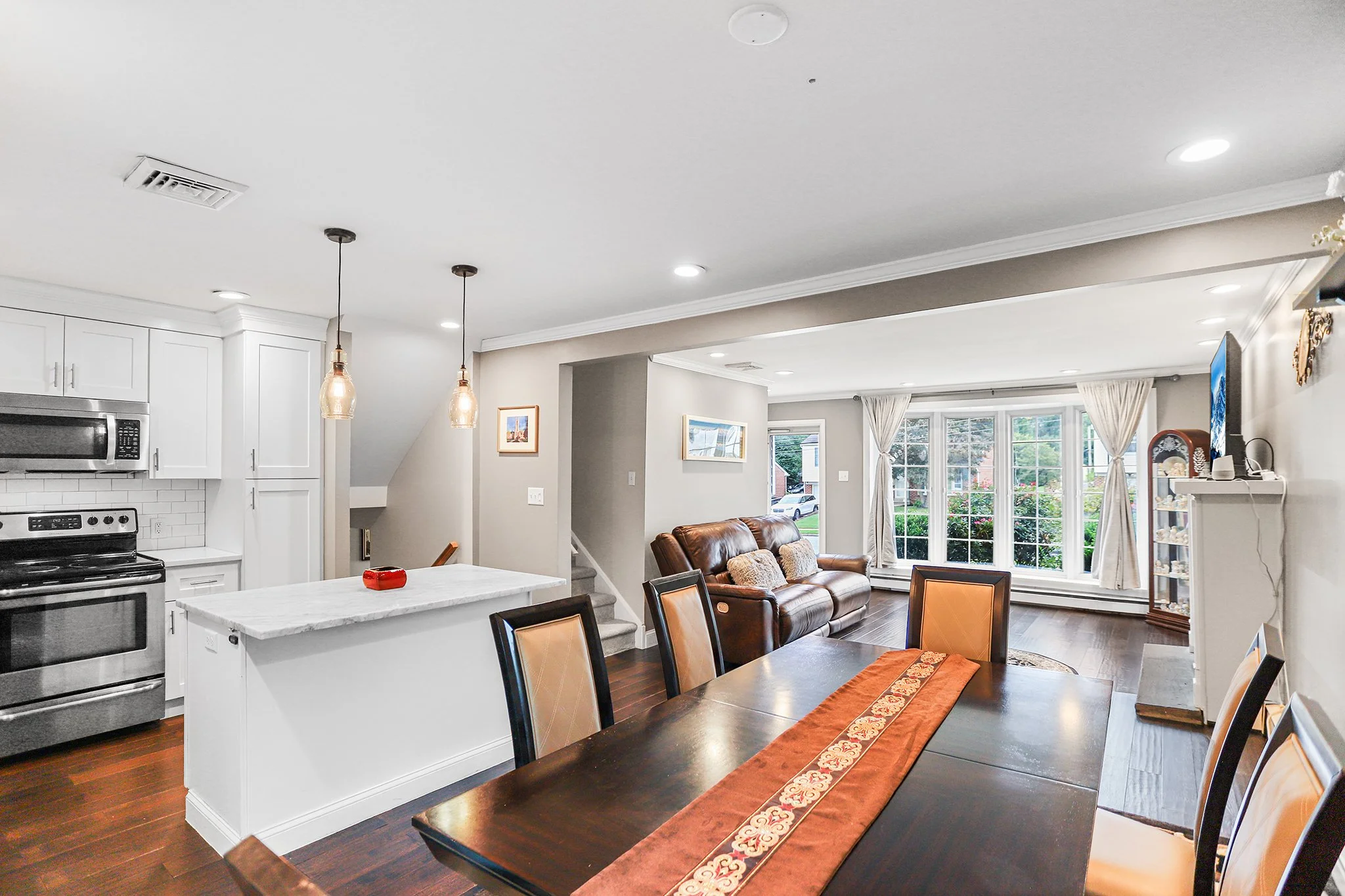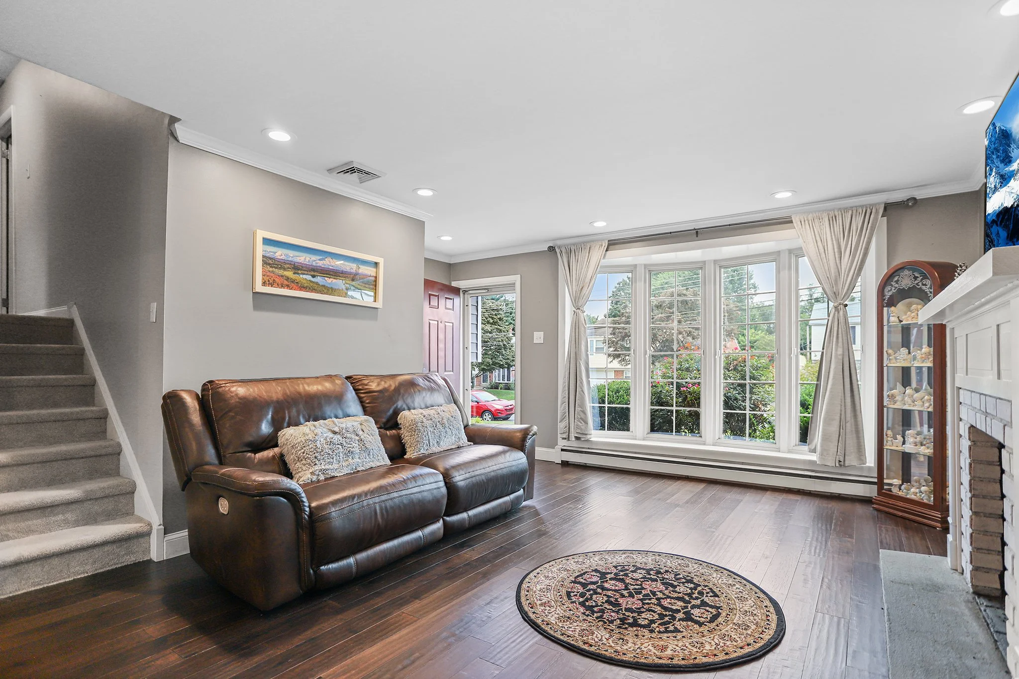 A landscaped walkway leads to an open concept, sunny living room with bow windows, gas burning fireplace, recessed lighting and modern hardwood flooring that flows seamlessly into the dining room and kitchen.
