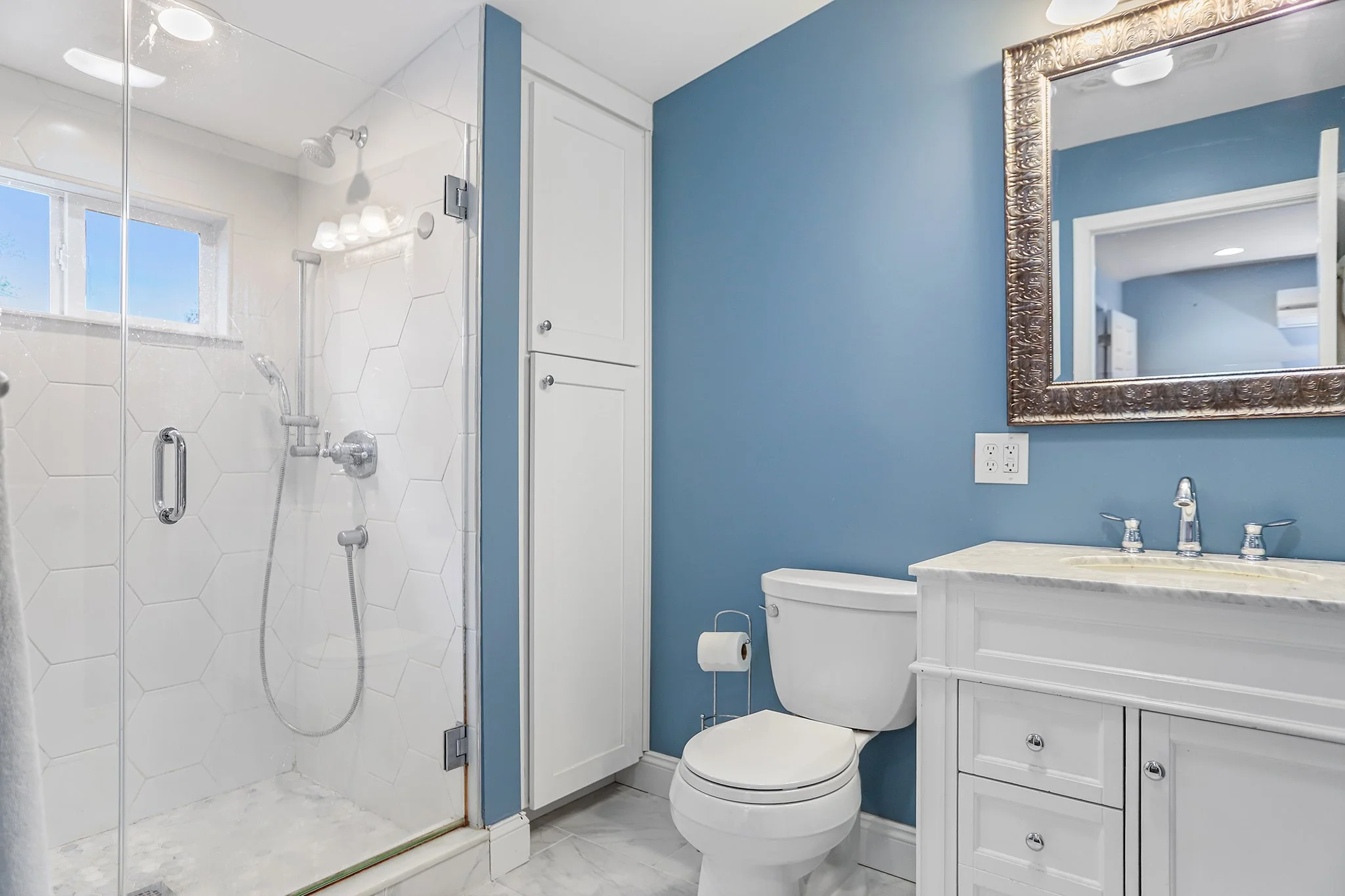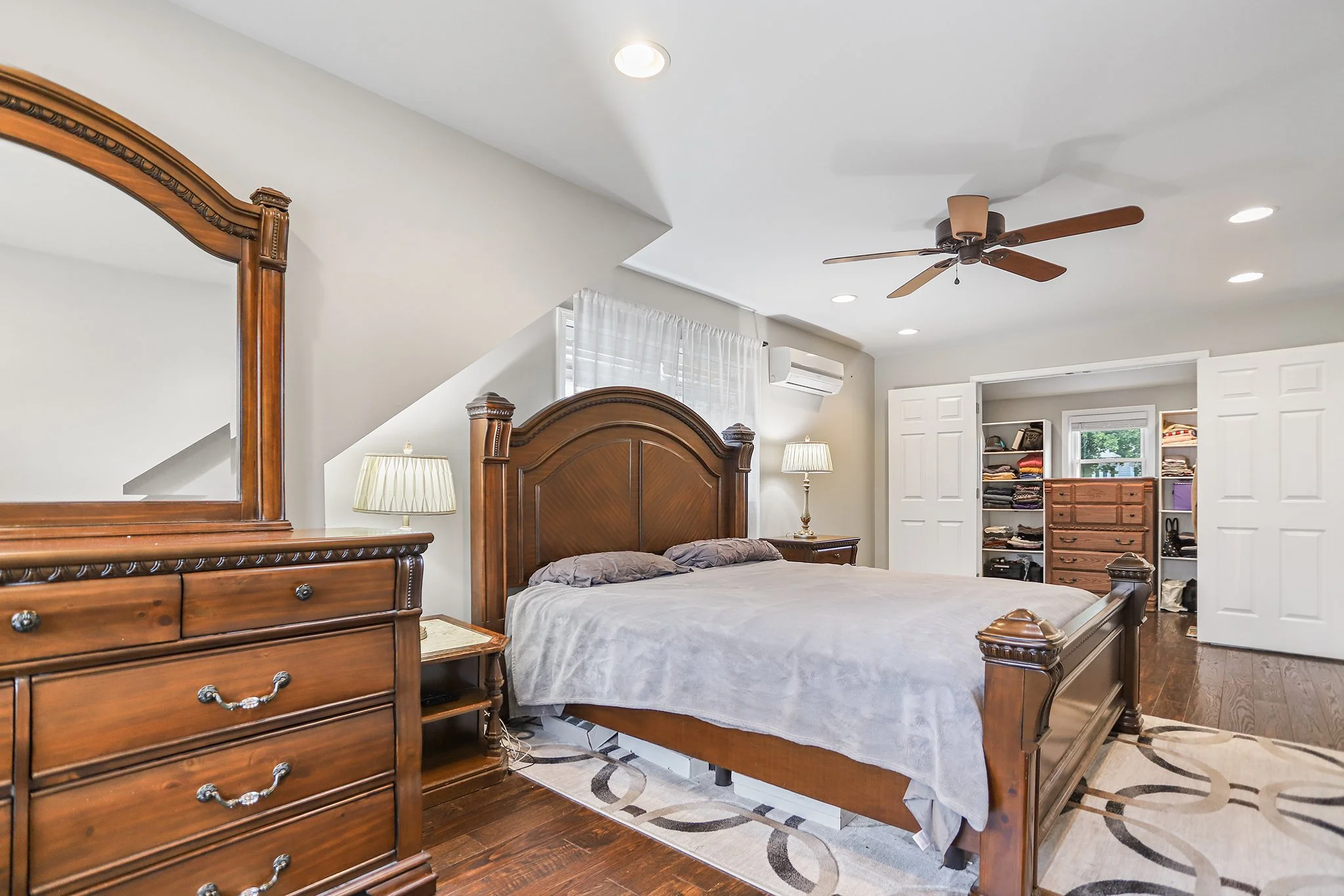 This spacious primary bedroom features modern hardwood flooring, recessed lighting and its own climate control system as well as a double-door walk-in closet and an en-suite primary bathroom with marble tiling and a frameless glass shower door.