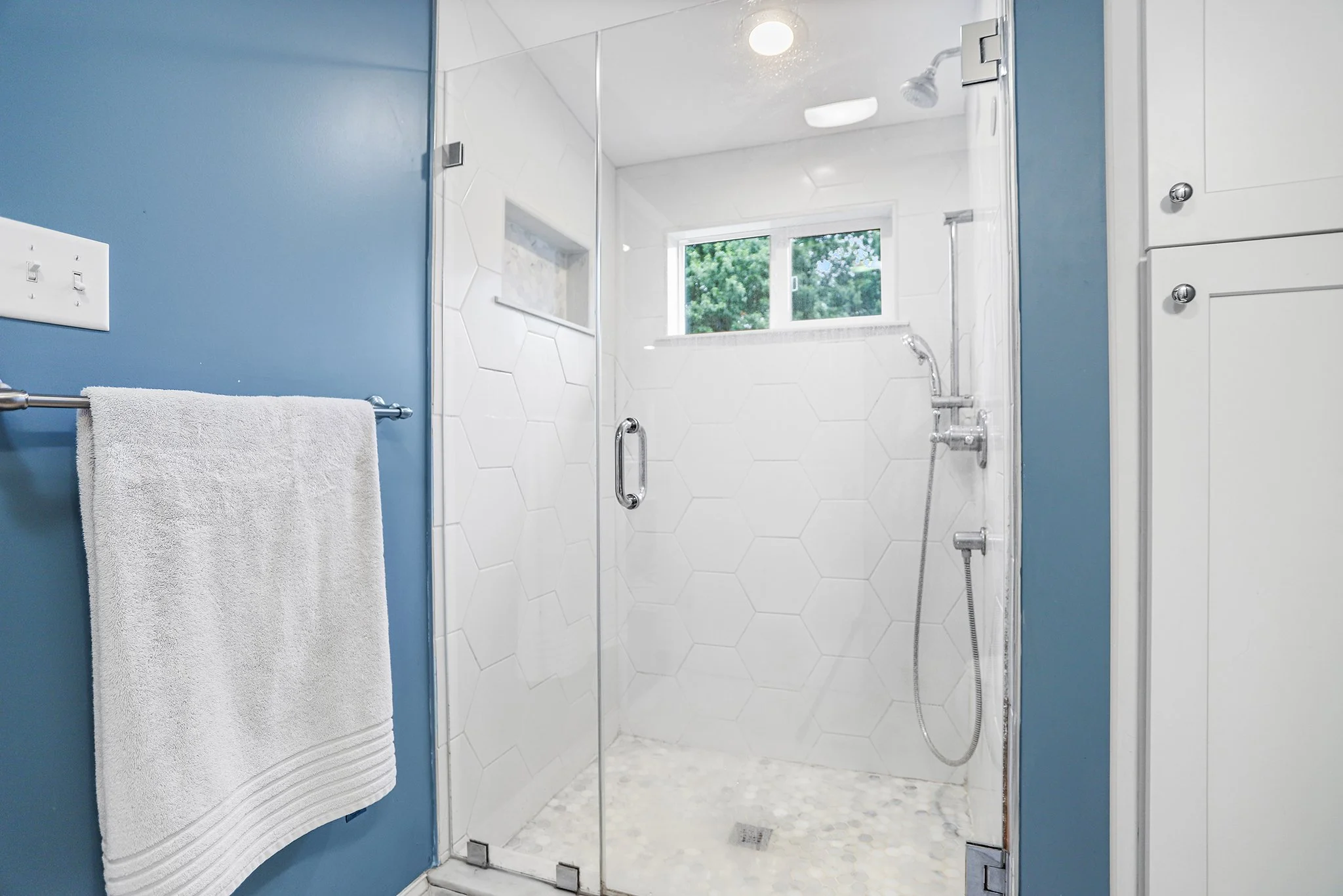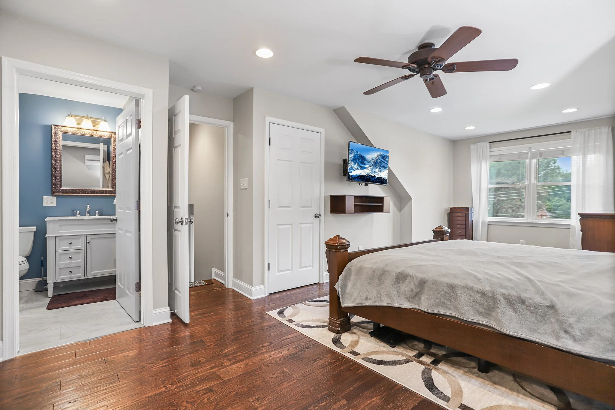 Back inside and down a few stairs is a mudroom/laundry room combination with interior access to a one car garage, a half bath with a wood accent wall and a family room. Upstairs are three spacious bedrooms all with overhead lighting, neutral carpet and ample closet space which share a hall bathroom with a spa tub. The primary bedroom suite encompasses the entire top level.