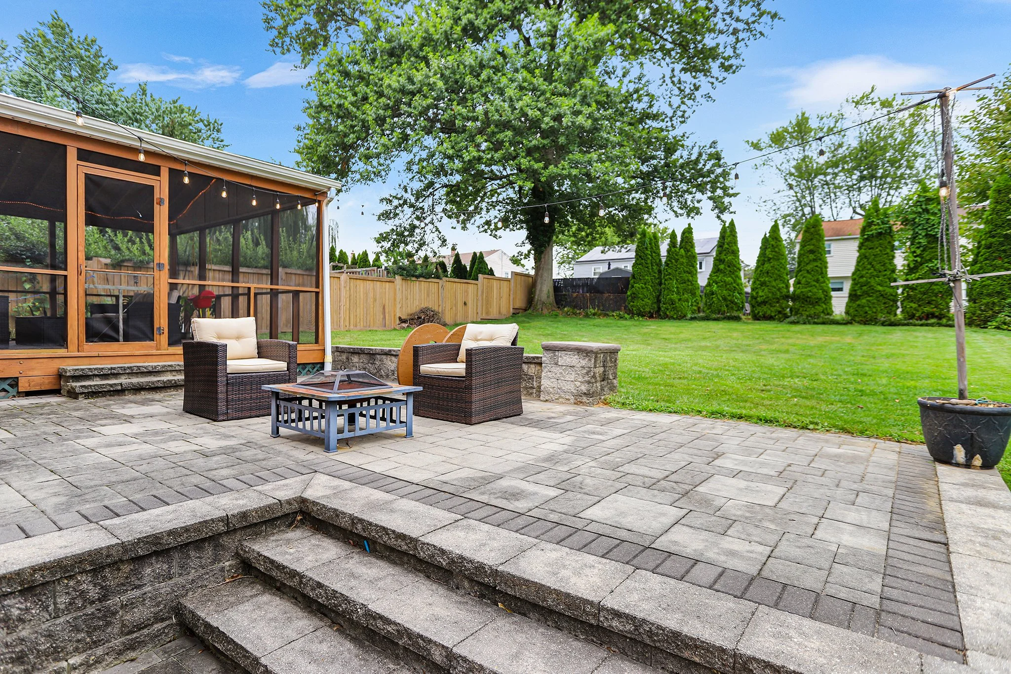 The impressive kitchen features a marble island with glass pendant lights, white shaker soft-close cabinets, subway tile backsplash and quartz countertops surrounding a deep stainless steel sink. Access the large screened in porch through sliding glass doors which overlooks a well-manicured lawn with mature arborvitaes and an oversized custom EP Henry paver patio.