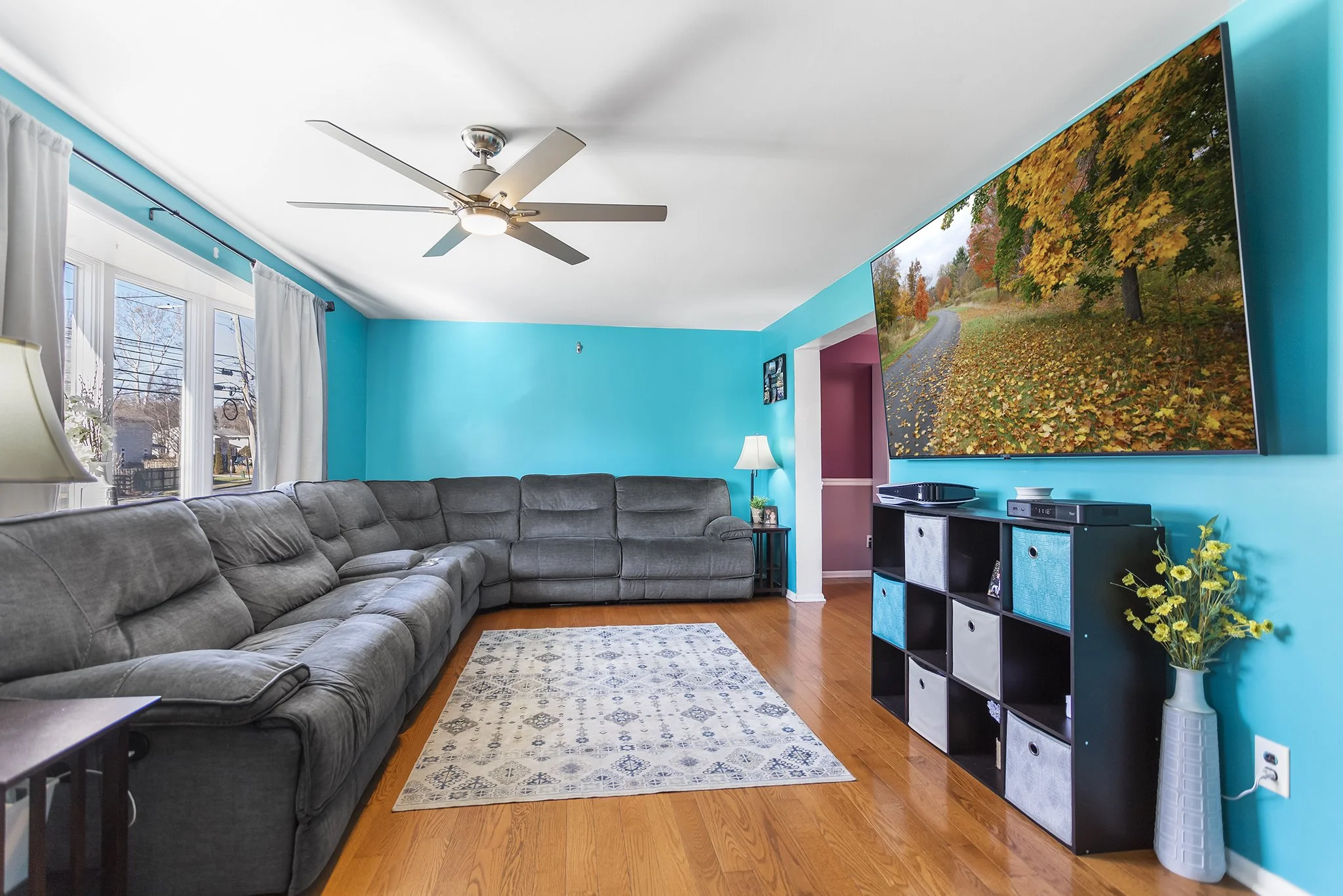 The main level flows seamlessly from the living room through the dining room and into the huge eat in kitchen. The gorgeous living room has hardwood floors, tons of natural light streaming through the front picture window and access to the dining room. Dining area includes a pendant chandelier and french doors to the large deck and yard.