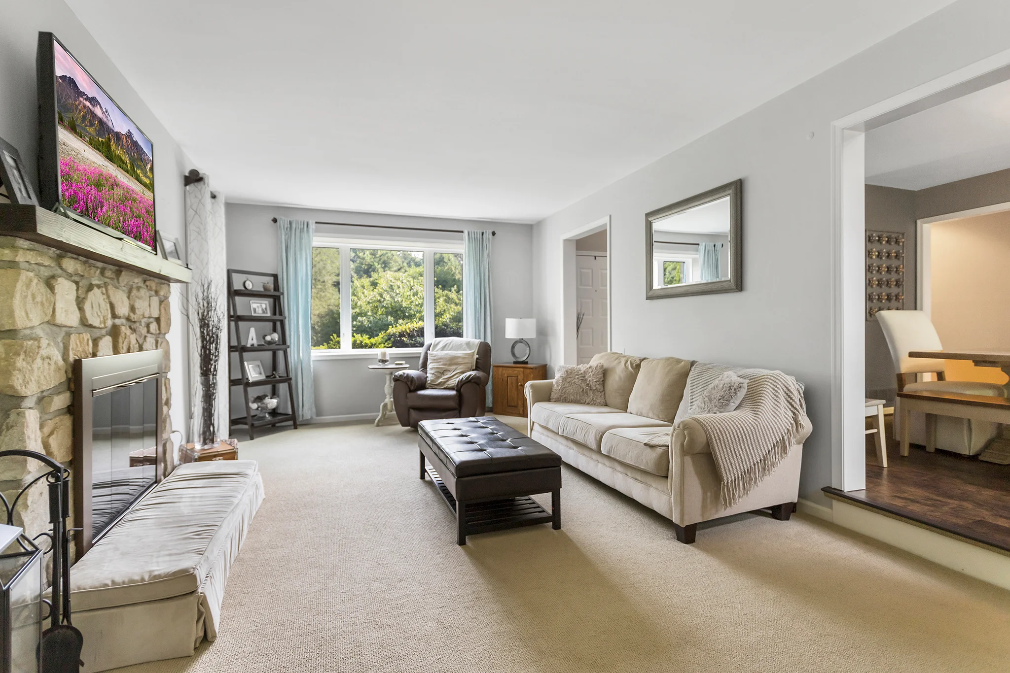 Formal Foyer two-story entrance makes this home feel open and airy. Large living room with sunny views of the creek is accented with custom crown molding, and a gas burning two-sided fireplace that is also visible in the family room.